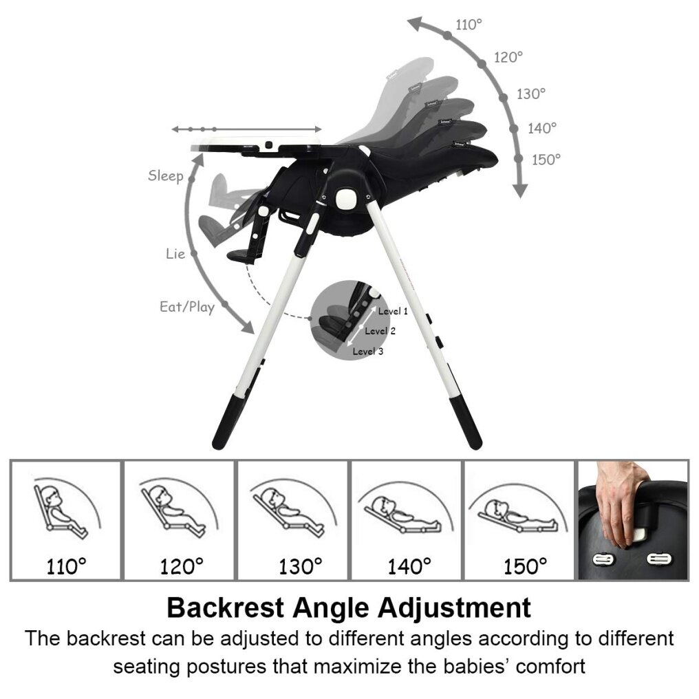 High Chair With Multiple Adjustable: Different with a traditional high chair, the baby highchair has multiple adjustable frames. The backrest is provided with 5 adjustable positions which is ideal for different use needs. And the footrest can also be adjusted into 3 different positions to meet the baby’s postures. The length of the footrest has 3 levels to fit your baby's body. The trays have 3 adjustable positions and the trays are also easily detachable when you don’t need them.