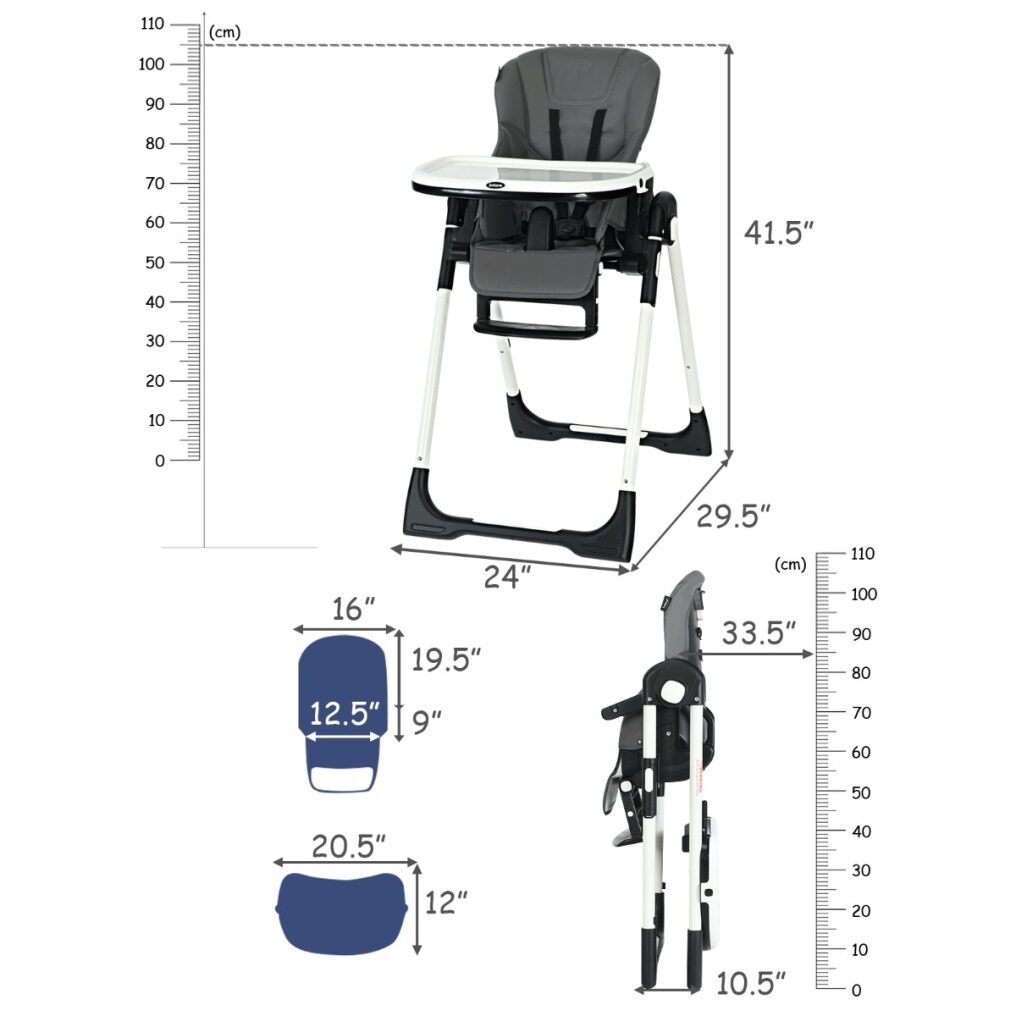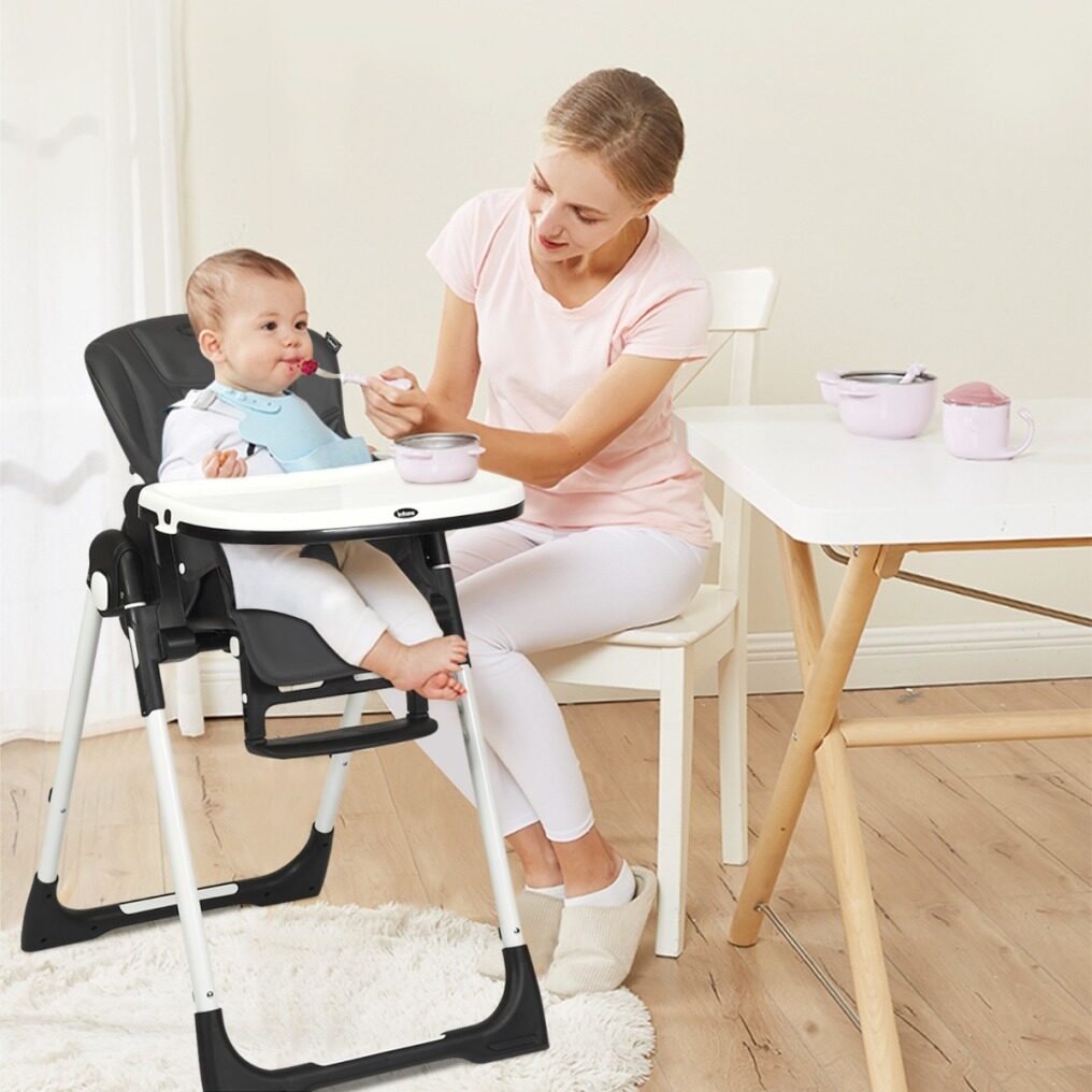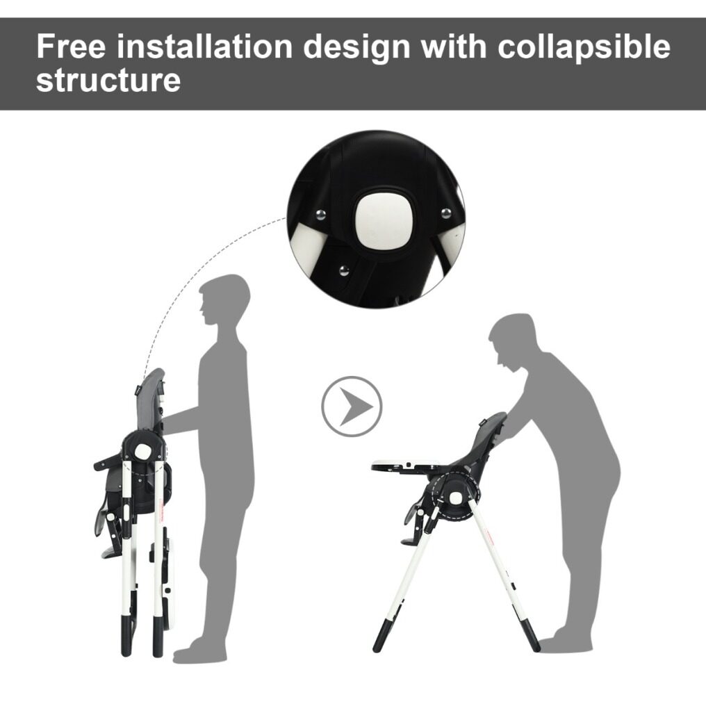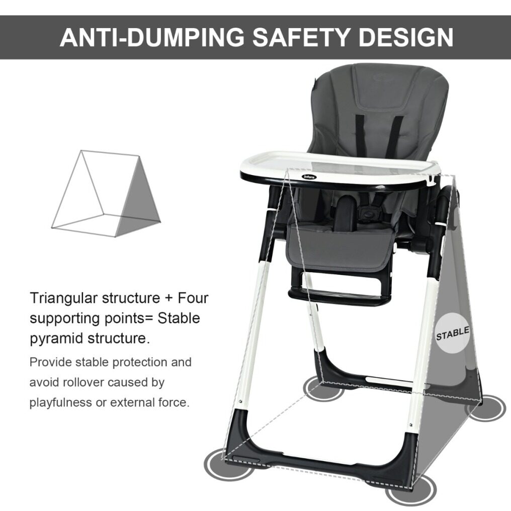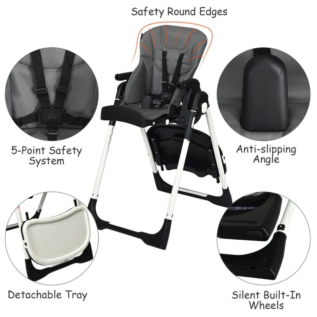 Easy To Clean With Detachable Design: Cleanliness has always been a top concern for baby products. Contact with detachable trays and seat cushions, this baby high chair is easy to clean and maintain after daily use. The removable PP top tray is also dishwasher safe. And the PU leather cushion is waterproof and you just need to wipe the smudges with a clean cloth. A 5-point safety harness ensures security for your little baby. All the corners of this baby highchair are smooth without sharp edges.