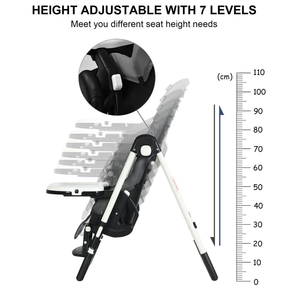 7 Levels Height Adjustable Design: This baby highchair has a user-friendly design that the seat height is adjustable with 7 positions. You no longer need to choose various high chairs to match different height tables in your home. Just buy one, you will have a versatile baby high chair to meet your furniture. We also use durable iron pipes as main structure to provide stable protection and avoid rollover caused by playfulness or external force.