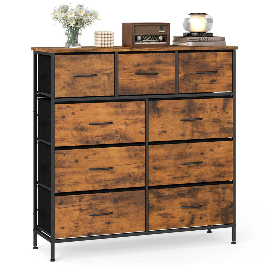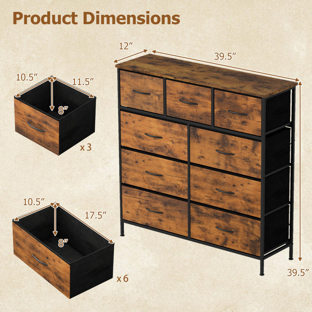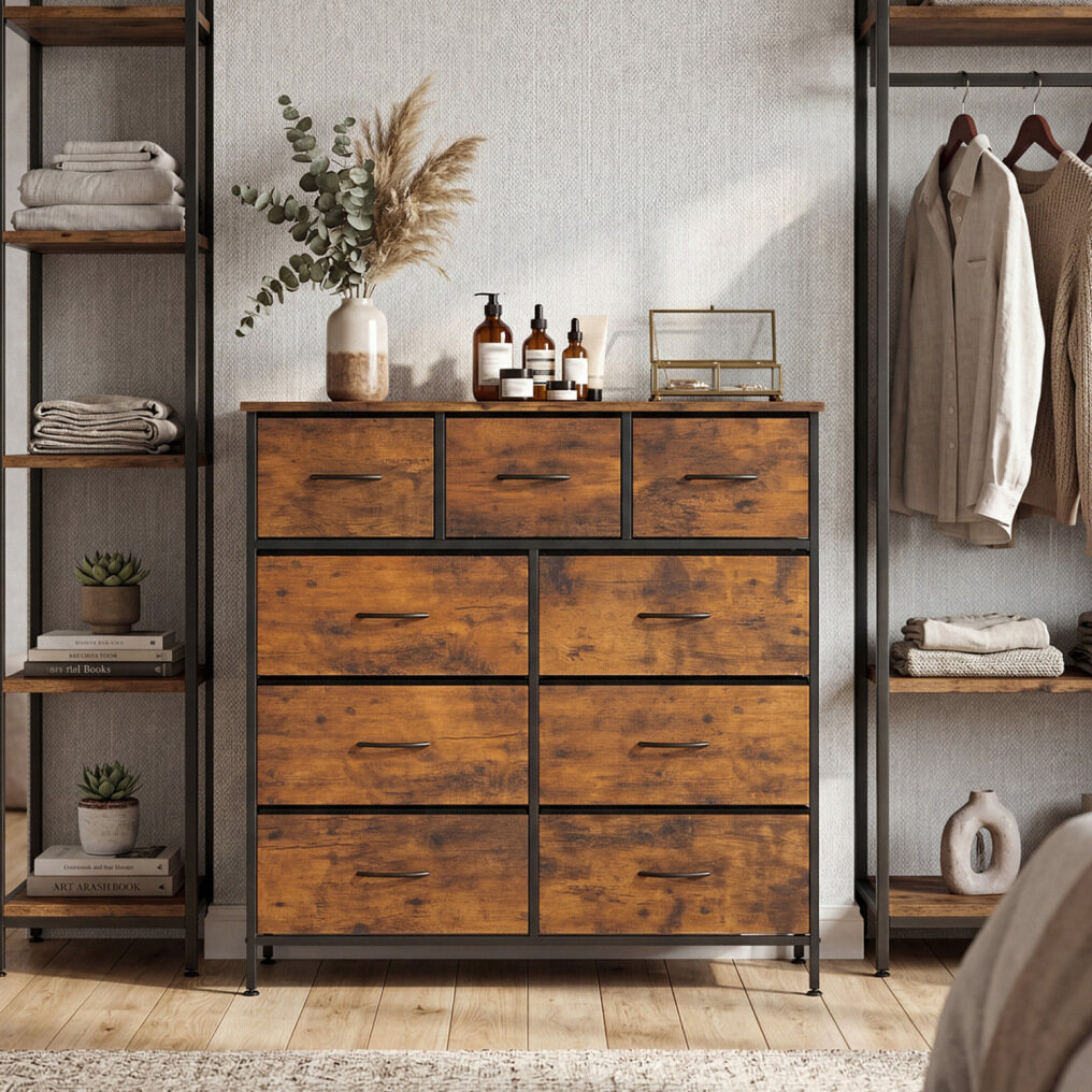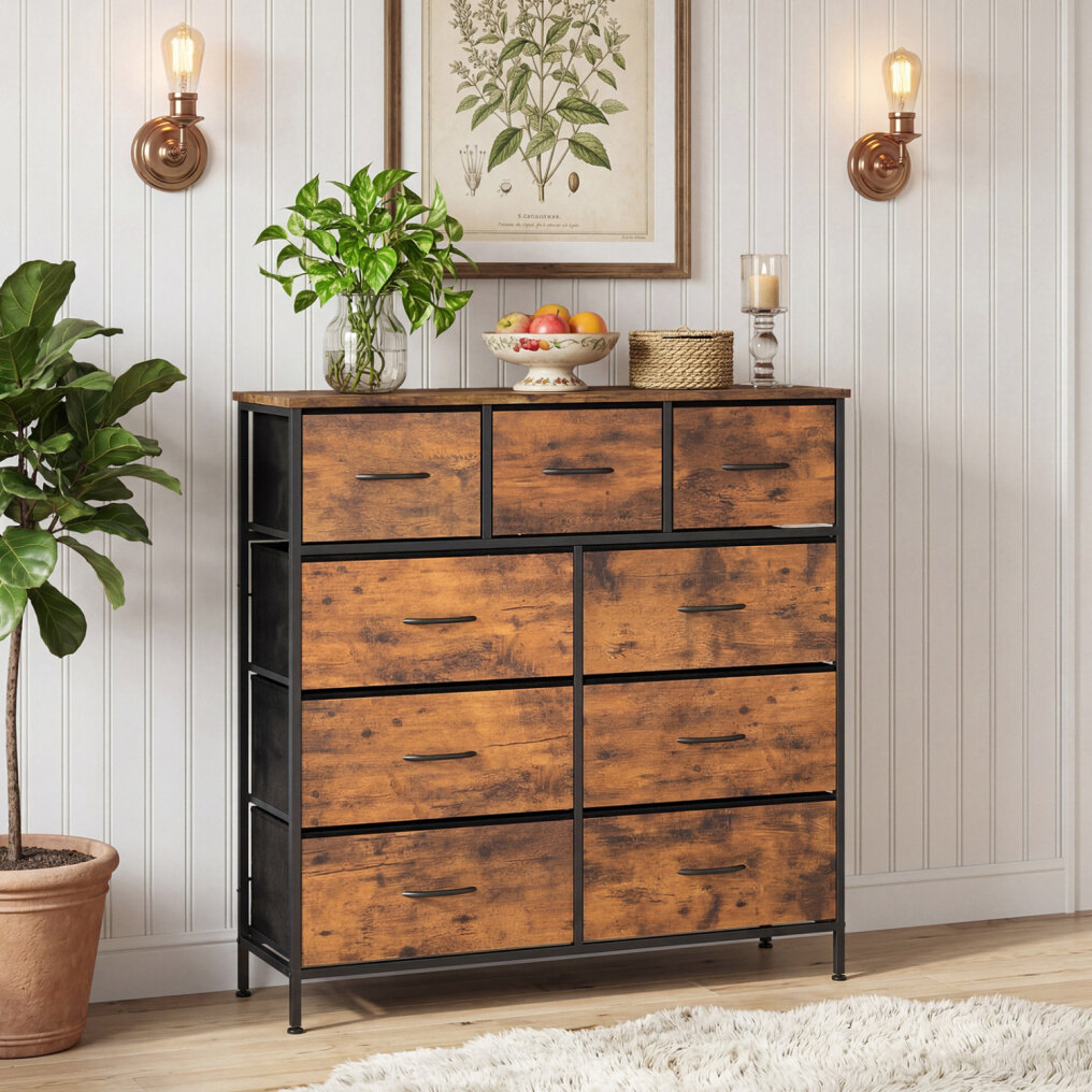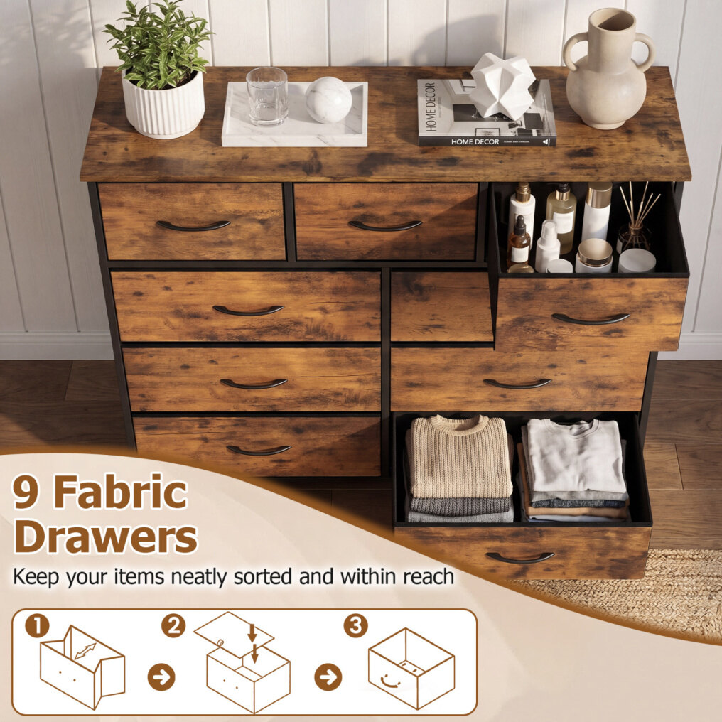 ● Spacious 9-Drawer Layout: This fabric dresser features 9 drawers, available in 2 sizes, comprising 6 large and 3 small. It efficiently keeps clothes or other belongings neatly organized and out of sight. Plus, the wooden countertop provides a broad surface area suitable for placing frequently used items.