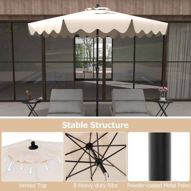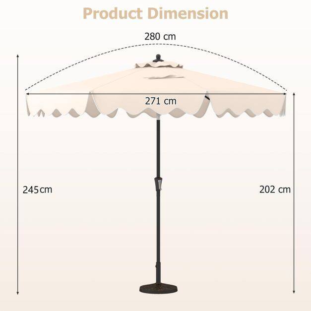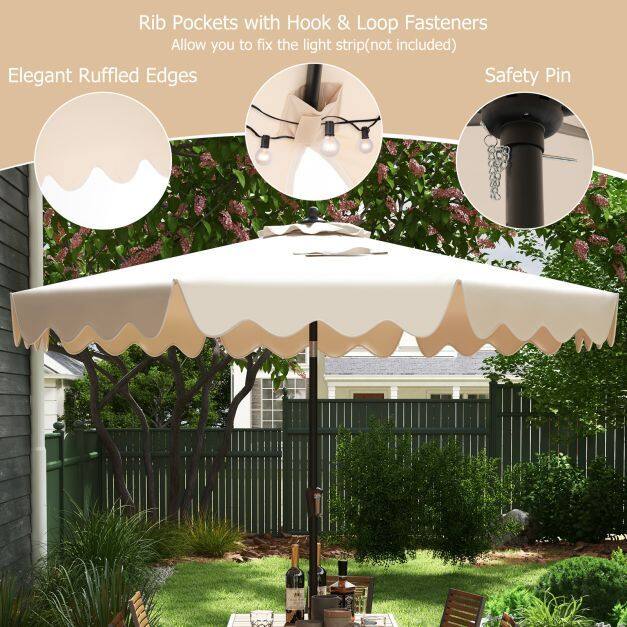 ● Elegant & Fashionable Appearance: This patio umbrella measures 9 x 8 ft (Dia. x H), offering ample shade for you and your loved ones to relax outdoors. It stands out with the decorative ruffled edges, adding a touch of elegance. Moreover, it features hook and loop fasteners for fixing decorations.