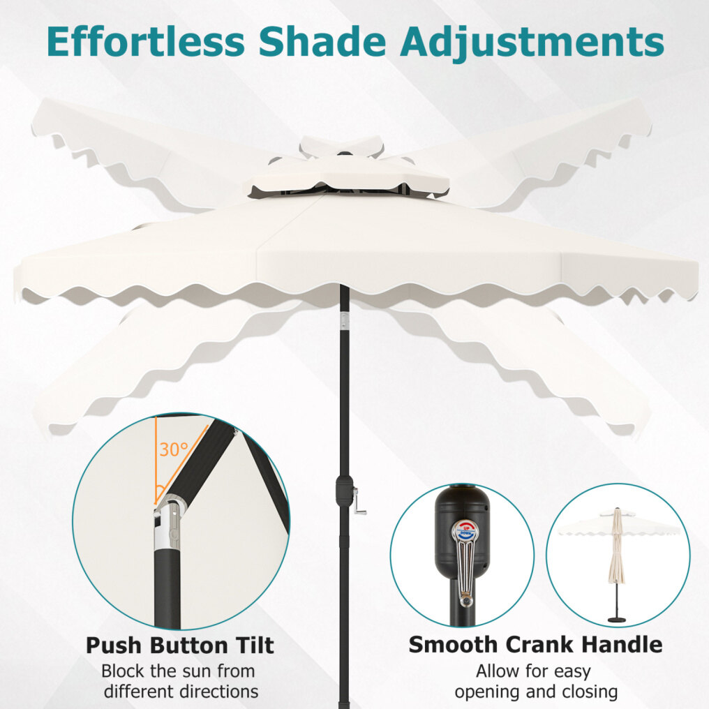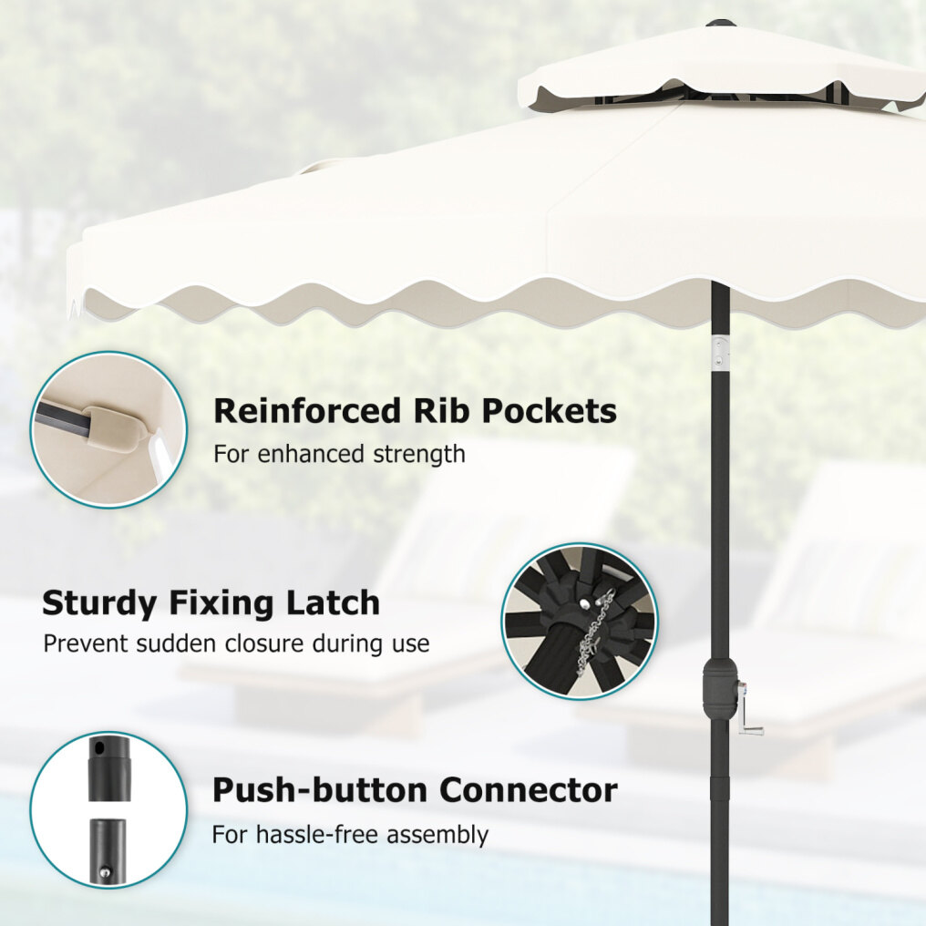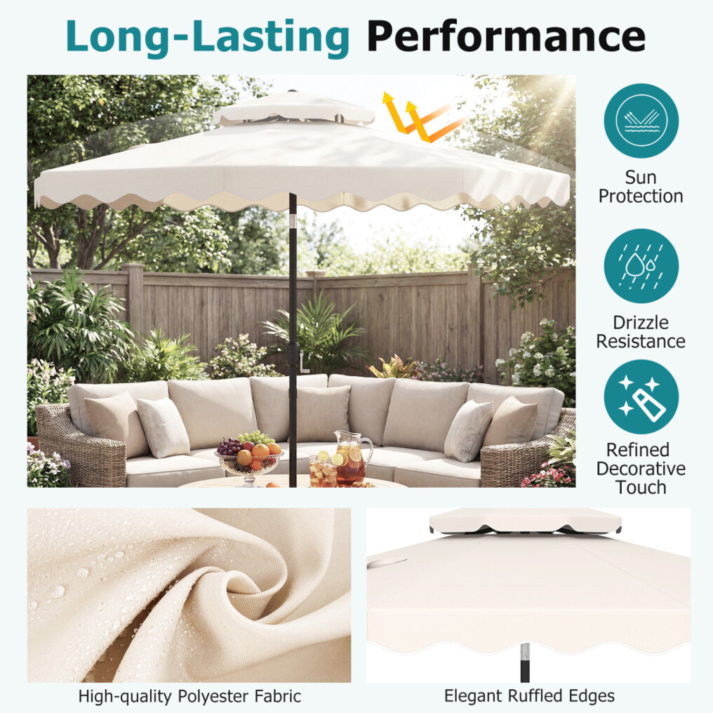 ● Shade Meets Elegance: The canopy of this outdoor umbrella is crafted from high-quality polyester fabric, for long-lasting performance, reliable sun protection, and drizzle resistance. Elegant ruffled edges and a scalloped valance bring a refined decorative touch, elevating everyday outdoor moments.