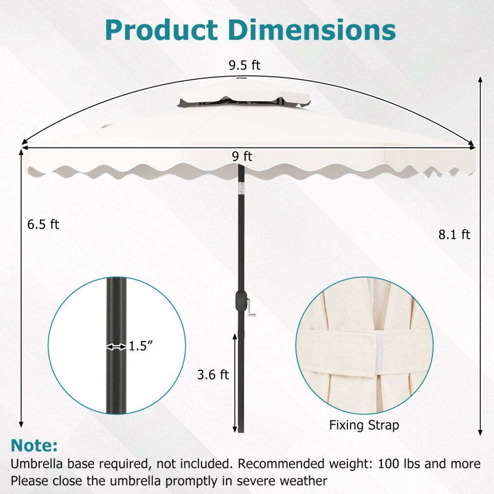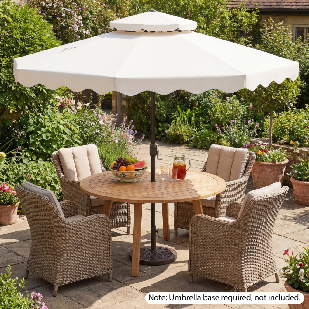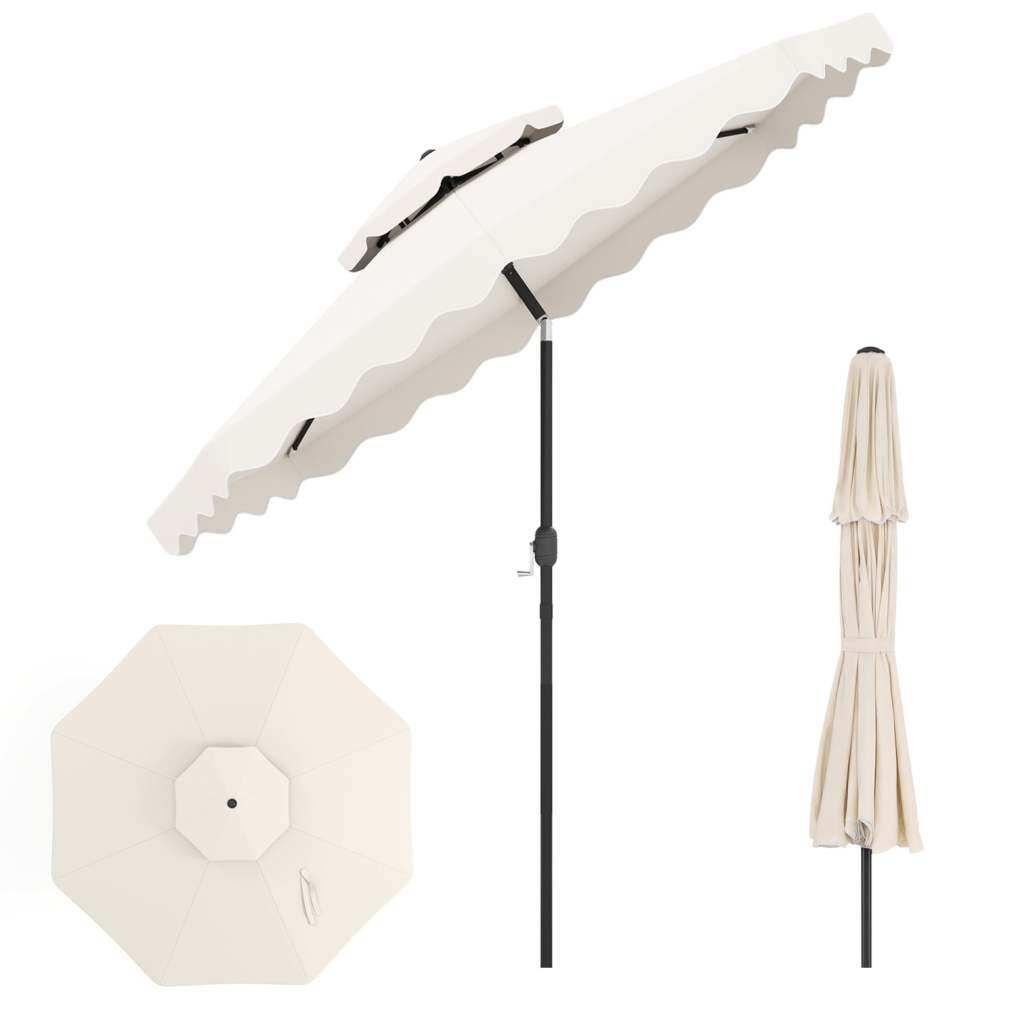 ● Shade Meets Elegance: The canopy of this outdoor umbrella is crafted from high-quality polyester fabric, for long-lasting performance, reliable sun protection, and drizzle resistance. Elegant ruffled edges and a scalloped valance bring a refined decorative touch, elevating everyday outdoor moments.