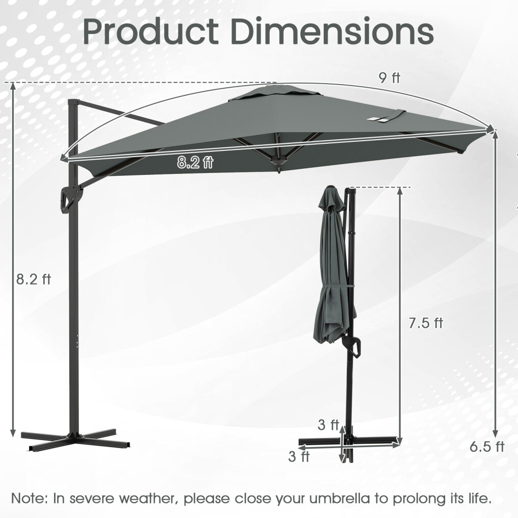 ● Large Shade Coverage: This cantilever patio umbrella measures 9 x 8.2 ft/267 x 250 cm (Dia. x H), offering expansive shade for outdoor leisure time. It is ideal for various outdoor spaces such as patios, gardens, poolsides, decks, and even commercial settings.