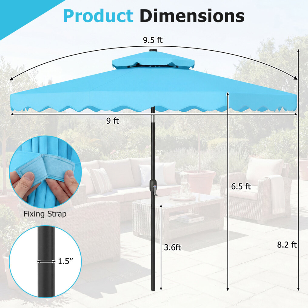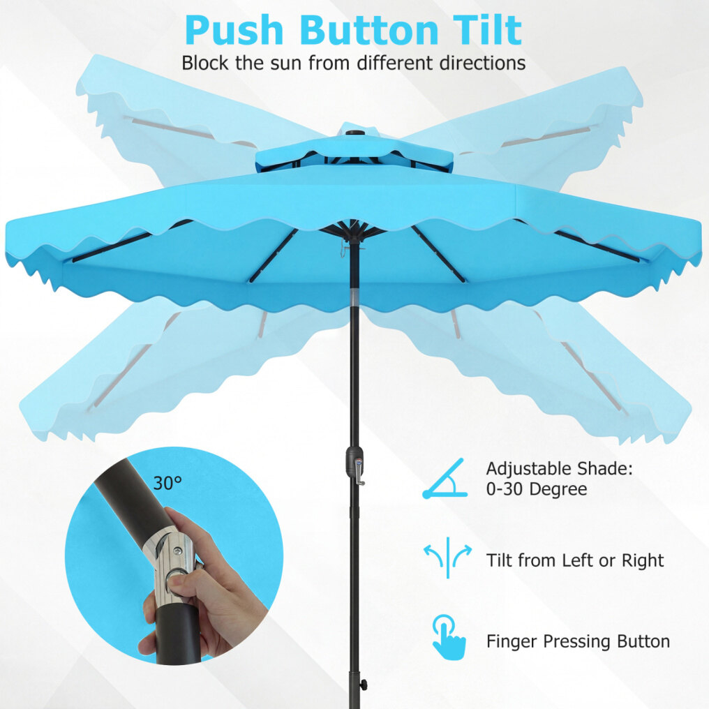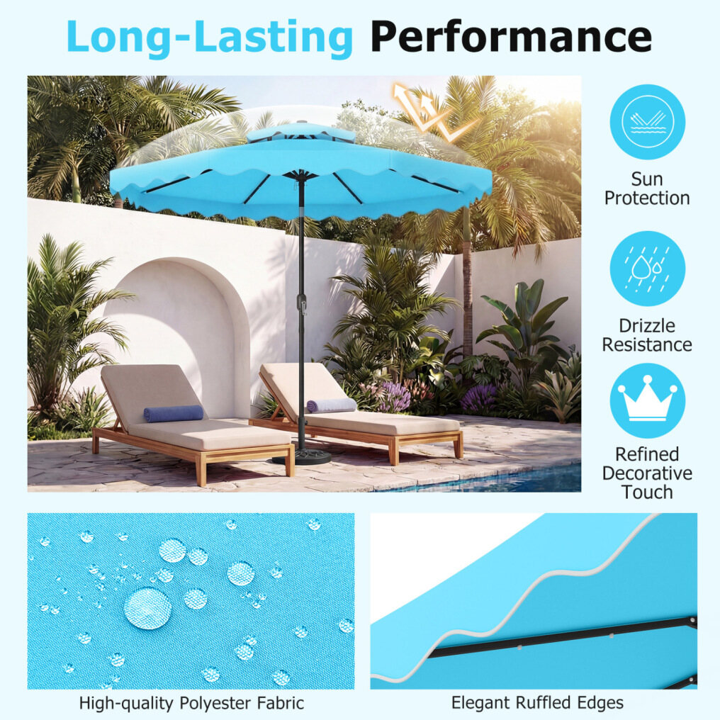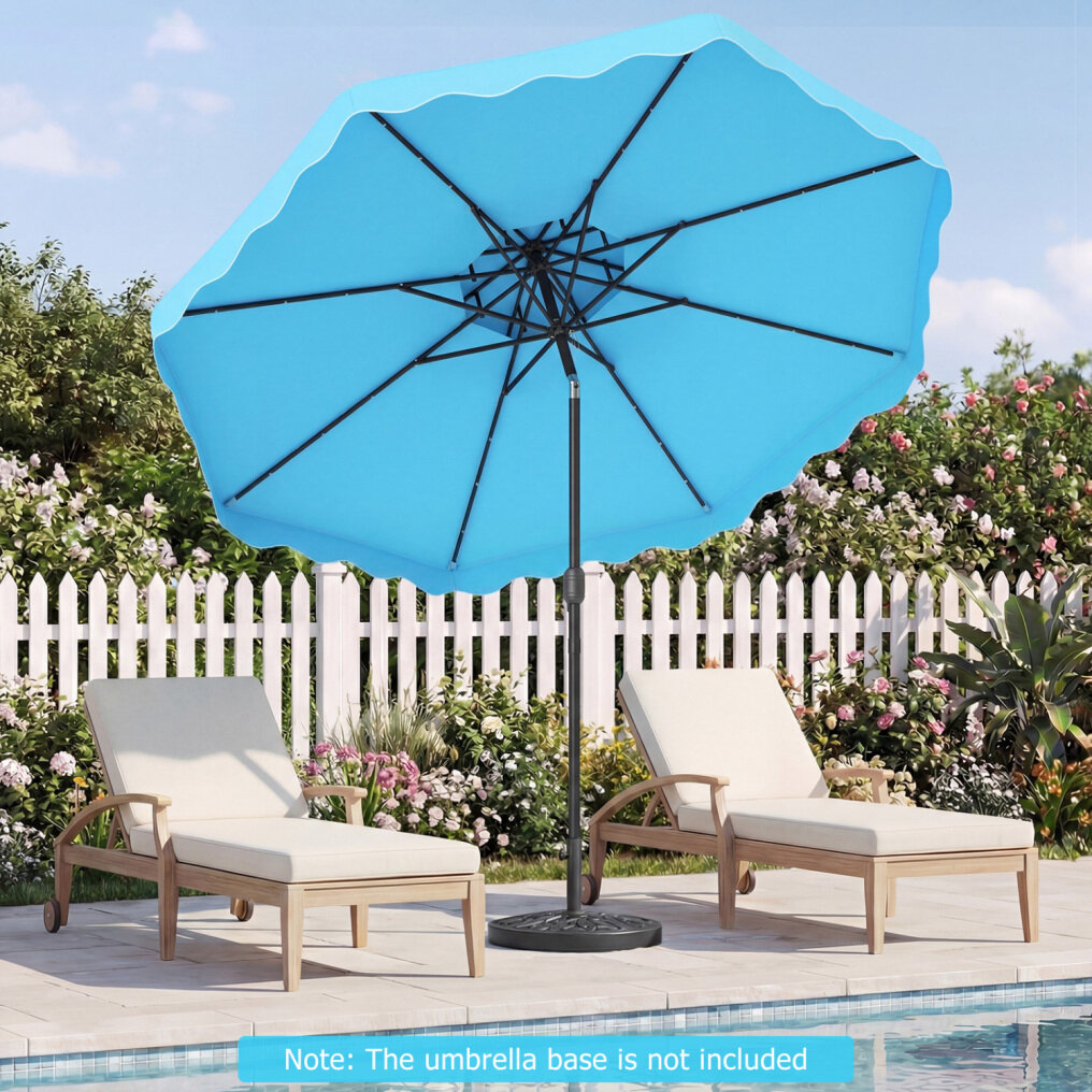 ● Shade Meets Elegance: The canopy of this outdoor umbrella is crafted from high-quality polyester fabric, for long-lasting performance, reliable sun protection, and drizzle resistance. Elegant ruffled edges and a scalloped valance bring a refined decorative touch, elevating everyday outdoor moments.