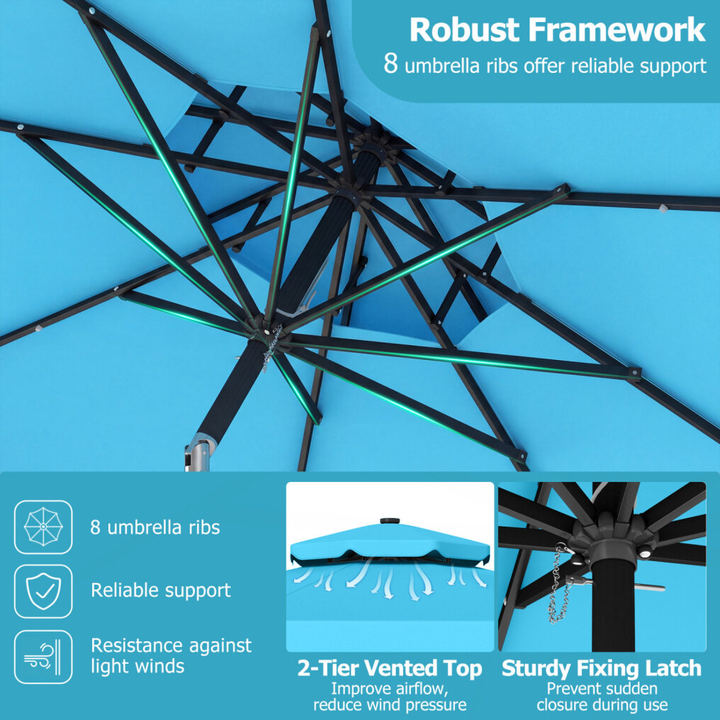 ● Breezy Stability Design: This patio umbrella is built around a robust framework with 8 heavy-duty metal ribs that offer reliable support and added resistance against light winds. Plus, its 2-tier vented top improves airflow, reduces wind pressure, and enhances umbrella stability.