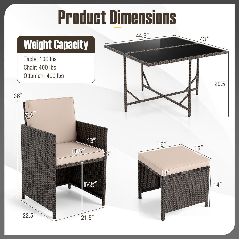 ● Ultimate Comfort Design: The patio dining set has 4 back cushions, 4 seat cushions, and 4 ottoman cushions, all of which are filled with high-density sponge and easily removable for easy maintenance. Additionally, each chair has an inclined backrest and cozy armrests, ensuring your guests enjoy hours of comfort during gatherings.