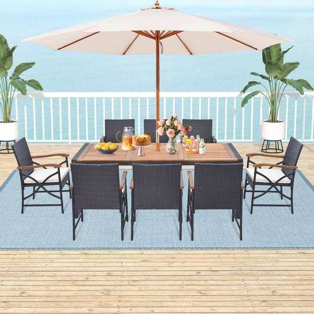 Crafted from solid acacia wood, fade-resistant PE rattan, and a heavy-duty metal frame, this patio table and chairs set ensures better outdoor performance while making your space look more beautiful. This rectangular dining table with a 1.9” umbrella hole not only creates sufficient space to hold different food but also allows you to add a patio umbrella (not included) for cozy shade. Besides, the ergonomic rattan chairs feature soft cushions, providing you with a comfortable sitting experience. To maximize your outdoor space, you can tuck 6 chairs under the table.