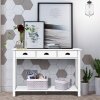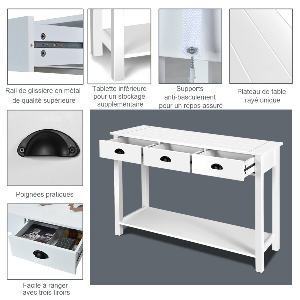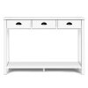 Are you worried about having nowhere to put your private items? Are you worried about not having a console table at home? This is our simple but fashionable sofa table which adds functionality to any room or hallway in your home. This writing desk can make a practical addition to any of your home or work space because the simple but great design. With the white appearance and smooth lines, the table can totally match the décor of your home. The sofa table has three spacious drawers and a shelf to provide extra storage space and keep your rooms stay neat. What’s more, this table is durable and stable which can be used for long time. At the top and bottom, you can put your crafts and furnishing articles. In the internal, you can store personal items and so on.