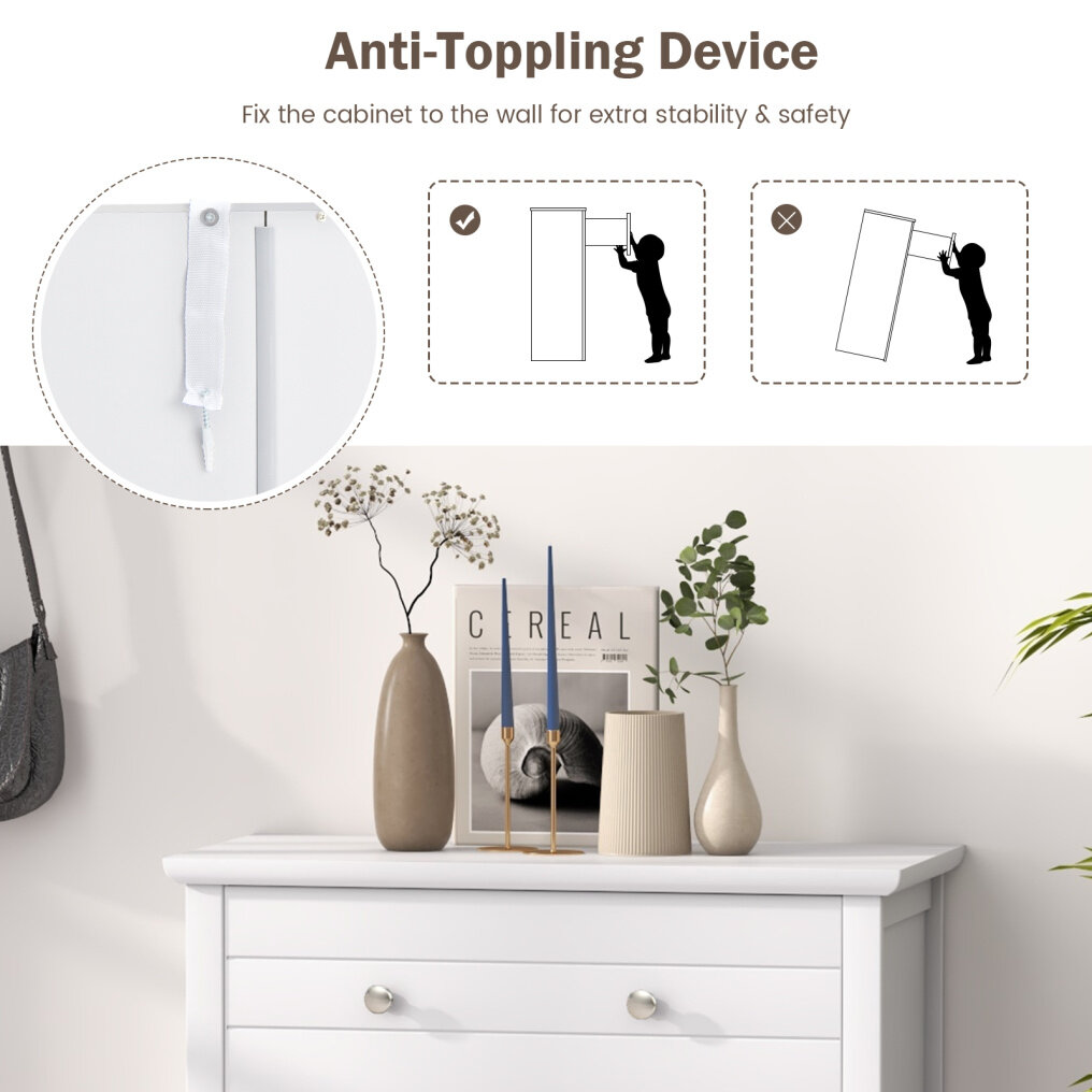Our cabinets are made of durable MDF. The painted surface is resistant to moisture and mildew, so the cabinet can be used in relatively humid places like kitchens and bathrooms. Of course, our white cabinets look very beautiful and fashionable and are also very suitable for the living room, bedroom, study, etc. The drawers and shelves with handles provide space for many things. To prevent the cabinet from tipping over, it can be securely attached to the wall.