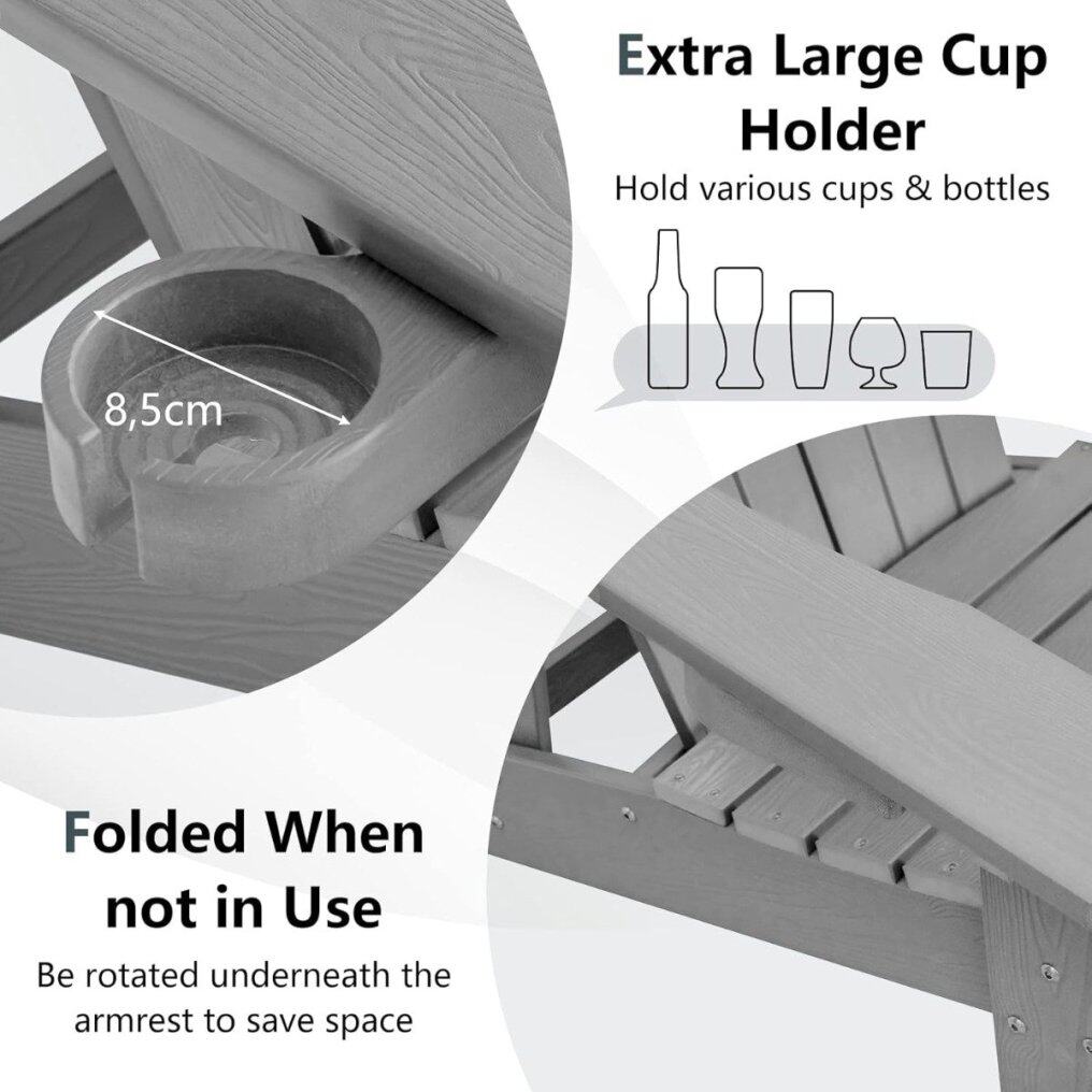 Our Adirondack chairs, made from high-quality HIPS material, are particularly weatherproof and, unlike conventional wooden chairs, reliably withstand sun, rain, and other weather influences – without fading, peeling, or cracking. This means they will accompany you for many years to come. The wide backrest and generous armrests offer pleasant relief for your back and arms. The ergonomic 105° tilt angle between the backrest and seat also ensures a high level of seating comfort and promotes relaxation. An integrated cup holder allows you to keep your favorite beverage close at hand. The individual components are reinforced with stainless steel screws for additional stability. Thanks to the high-quality craftsmanship and realistic wood grain, the chair impresses with its elegant appearance. The classic design with a serrated backrest makes it a stylish eye-catcher – whether in the garden, on the terrace, or by the pool.