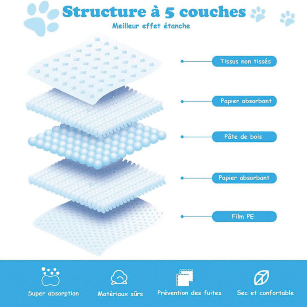 【Super Absorbent Trainer Mat】Our 5-layer dog pad is made of non-woven fabric + absorbent paper + wood pulp + absorbent paper + PE film, which quickly absorbs moisture and prevents leakage.