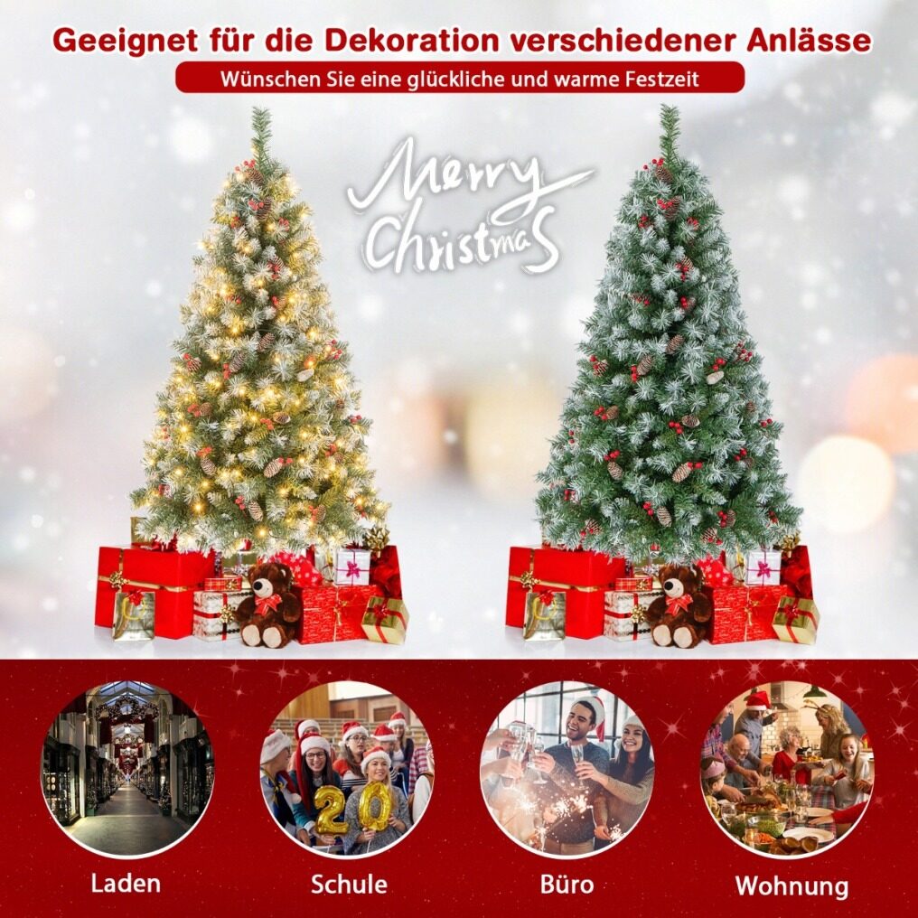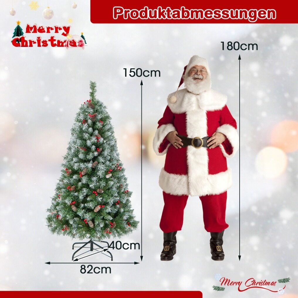Luxurious & Complete Appearance: The 150cm artificial Christmas tree features 450 lush branch tips and is decorated with 42 natural pine cones and 126 vibrant red berries, providing a lifelike look that will impress your guests. In addition, there are 2 types of leaves with romantic snow patterns that add variety and texture.