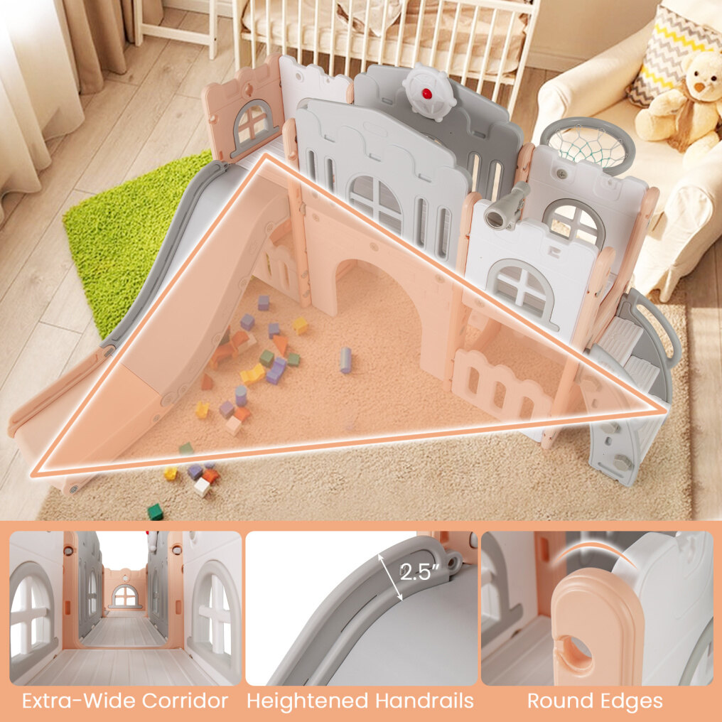 All in 1 L-Shaped Toddle Slide: The Kids slide offers multifunctional fun with a telescope, climber, slide, Crawling Tunnel, basketball hoop, hiding spot, steering wheel and storage area. It’s a complete entertainment hub that keeps your child engaged and active.