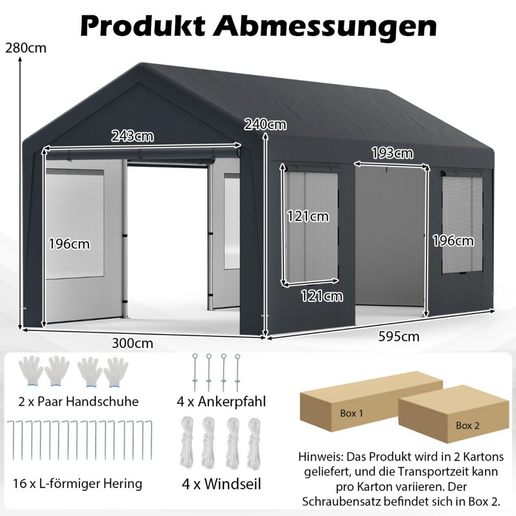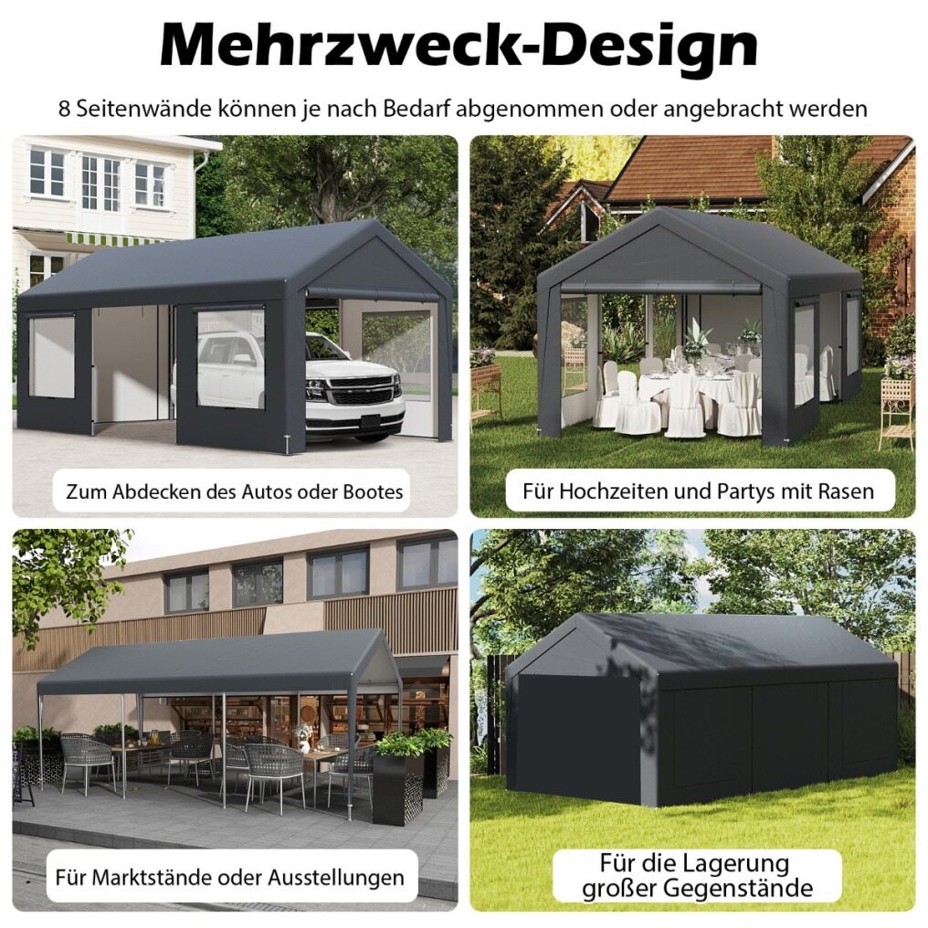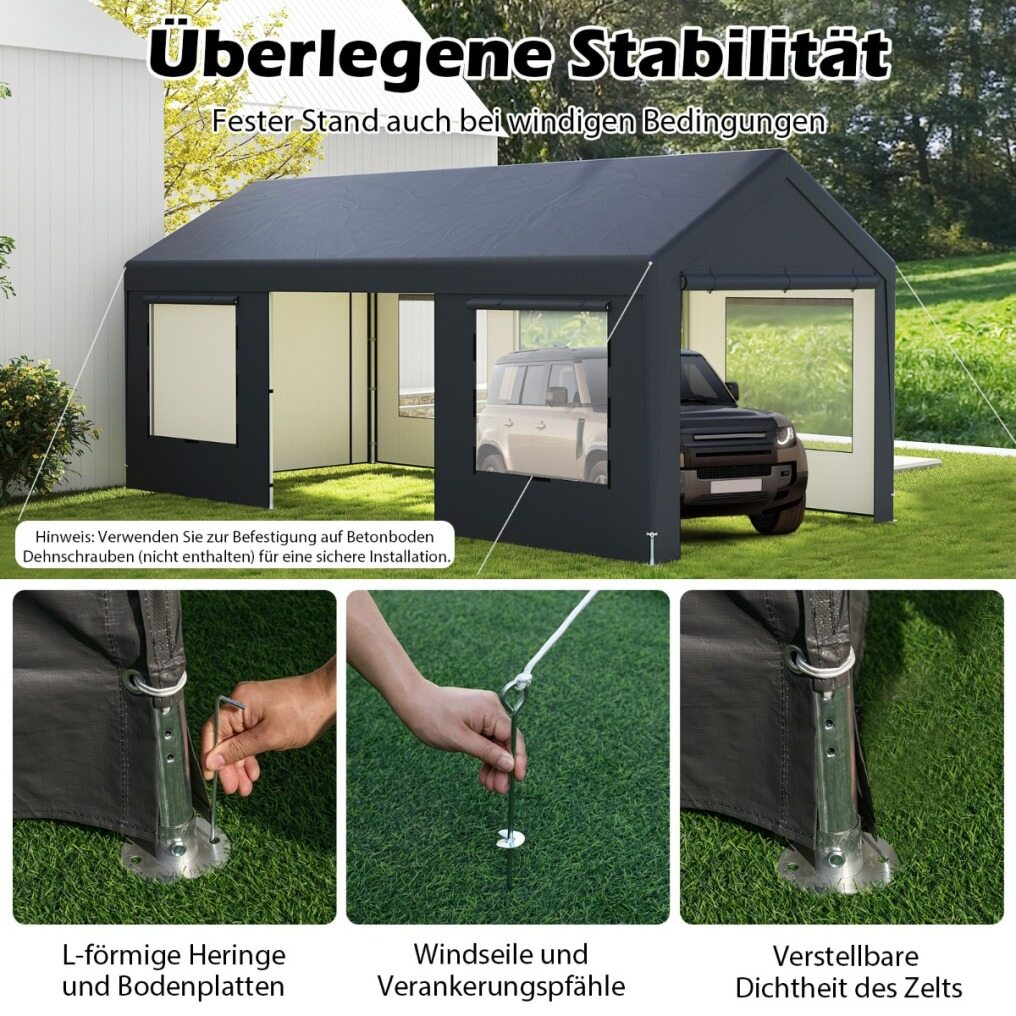 Our extra-large carport measures 600 x 300 x 280 cm (L x W x H) and the front door measures 243 x 196 cm (L x H), providing enough parking space for your vehicles, boats, or tools. It comes with 8 detachable sidewalls, including 4 doors, offering flexible installation options for various configurations to suit different needs. Thus, you can also use it as a seasonal shade for your backyard, lawn, or poolside, a temporary shelter for lawn weddings and parties, a commercial tent for market stalls or exhibitions, or even as a tool shed for storage large items. Built to last, it is crafted from a robust galvanized metal frame and all-weather PE cover, ensuring reliability and sturdiness under all weather conditions. Moreover, it is equipped with 4 wind ropes, 16 L-shaped ground stakes, and 4 anchor stakes, ensuring the carport remains stable and secure, no matter the weather. The inclusion of 4 double-layer mesh windows optimizes airflow, making it a comfortable venue for any occasion.