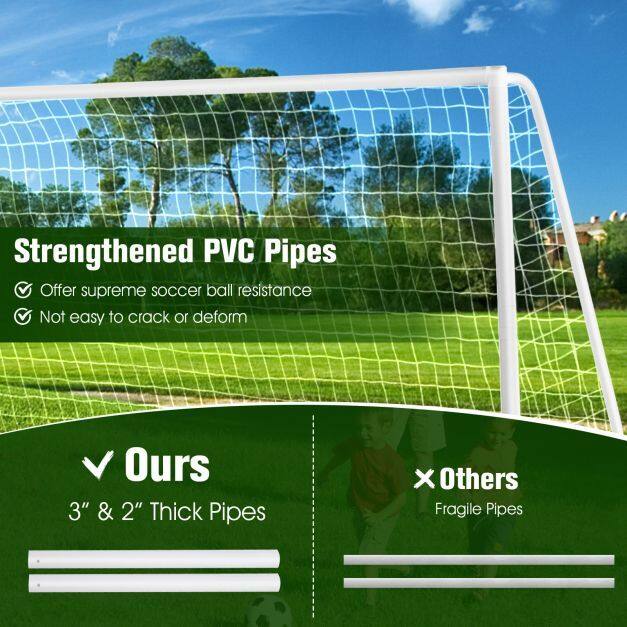 Strong and Stable Structure: The portable soccer goal is constructed of 3" and 2" strengthened PVC pipes, which are thickened than others, offering supreme soccer ball resistance while ensuring great crack resistance and deformation resistance. Besides, it features 6 ground pegs for firmly fixing the soccer goal to the grass.