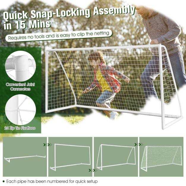 This soccer goal measures 365 x 120 x 182 cm (L x W x H) and only weighs 11 kg, which is portable and lightweight for outdoor use, and you can install it anywhere you want. The soccer goal is supported by a sturdy PVC frame, which provides strong support and ensures great sturdiness, and there exist 6 metal ground pegs for fixation, ensuring excellent stability and wind resistance. And it features an all-weather and durable PE netting that can withstand numerous fierce shots. Moreover, this soccer training equipment is quite easy to set up and the installation process requires no tools. Whether having soccer training with friends, enjoying happy family exercise time, or having a soccer match, this soccer net would be a perfect choice!