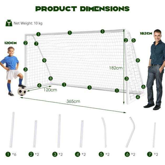 Soccer Practical Equipment: This soccer goal measures 365 x 120 x 182 cm (L x W x H), which is suitable for kids and juniors to have soccer practice/training sessions or enjoy leisurely play with parents or friends. And it is perfect for playing soccer in the backyard, playground, lawn, beach, and more.