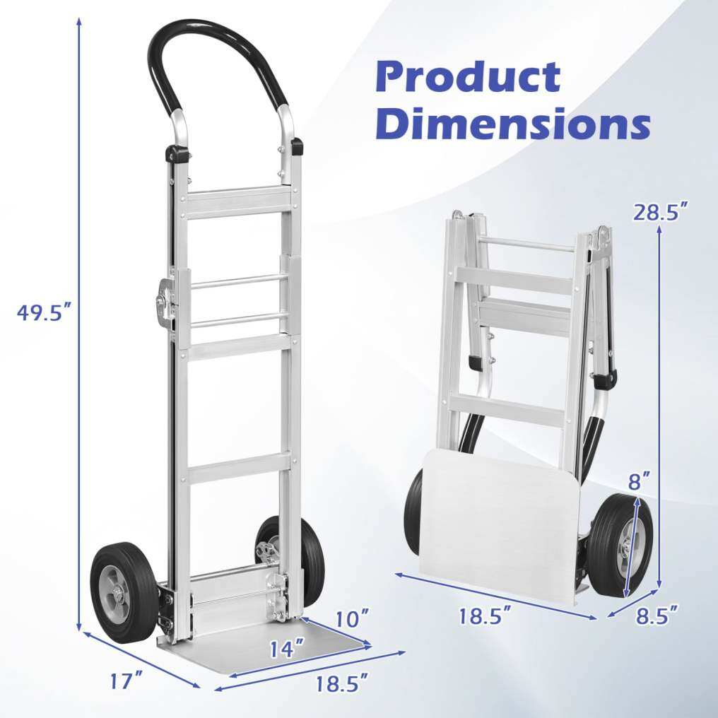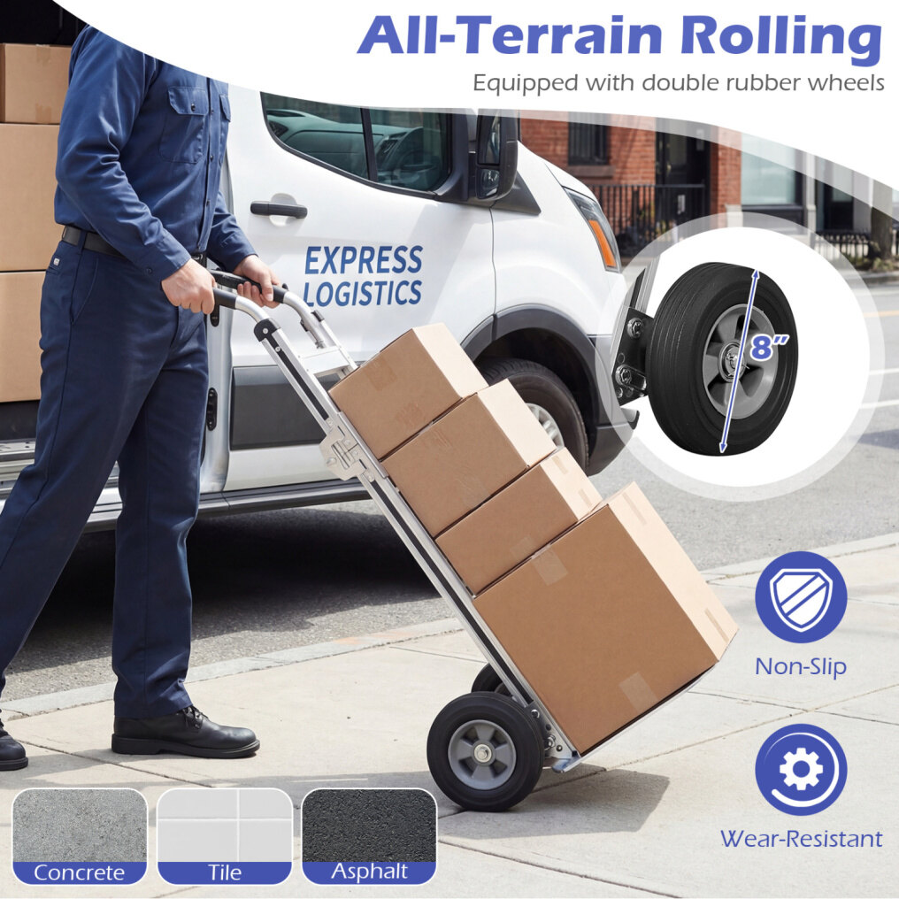 ● All-Terrain Rolling: Equipped with double 8-inch rubber wheels, this aluminum dolly cart rolls smoothly over concrete, tile, asphalt, and warehouse floors. The non-slip, wear-resistant tires also improve stability and traction.