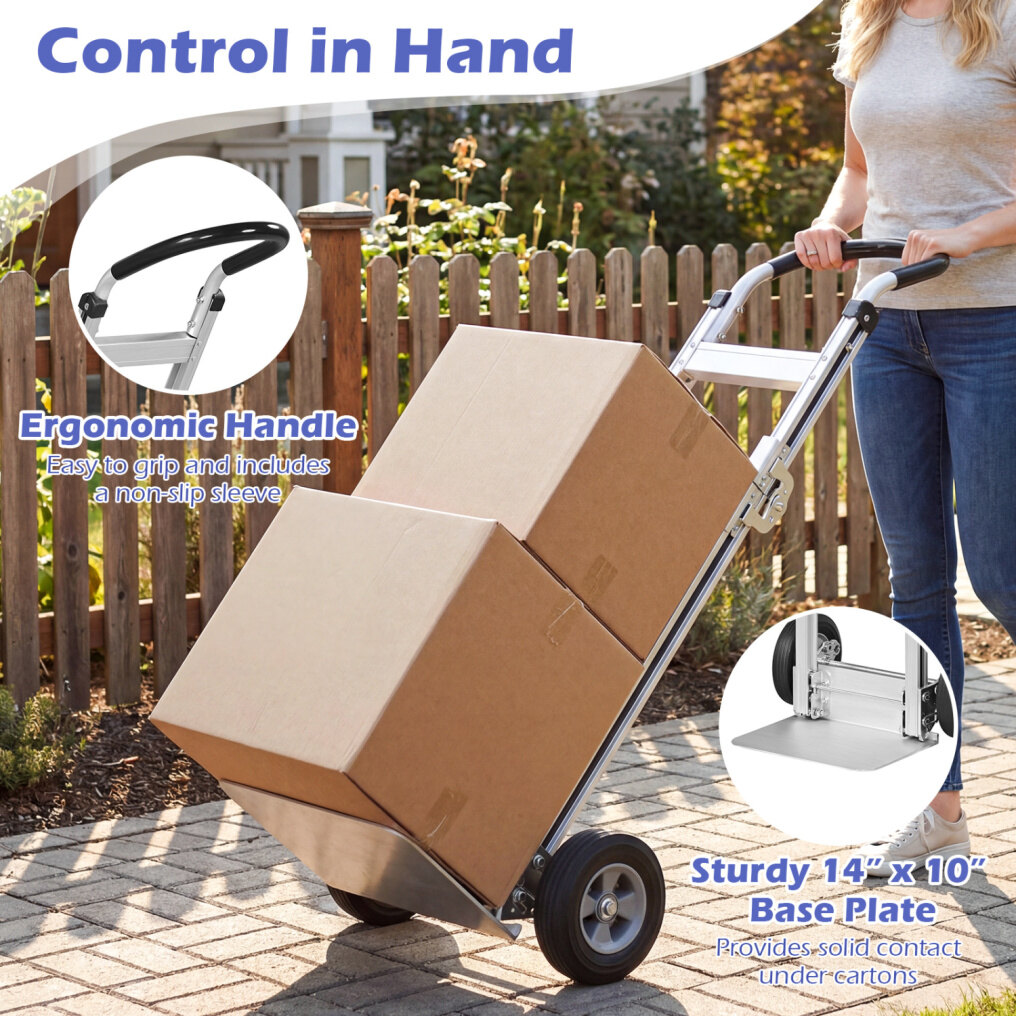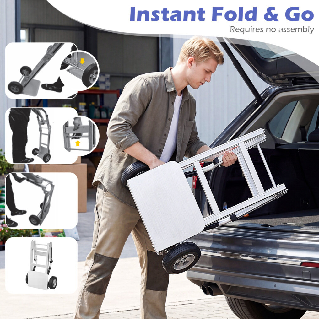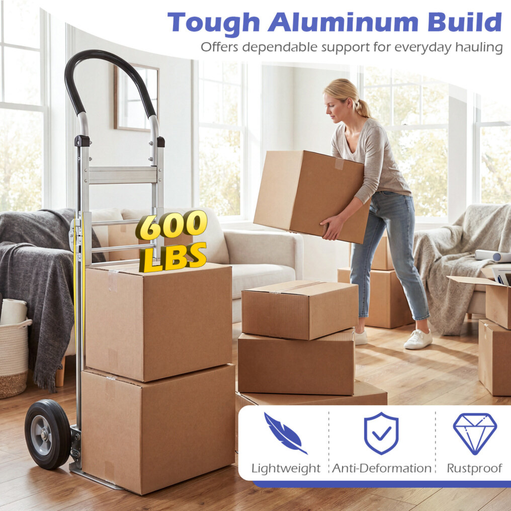 ● Tough Aluminum Build: Mainly constructed of premium aluminum that resists rust and warping, this folding dolly cart offers dependable support for everyday hauling. The heavy-duty structure loads up to 600 lbs, giving you confidence when moving boxes, appliances, tools, or bulk supplies.
