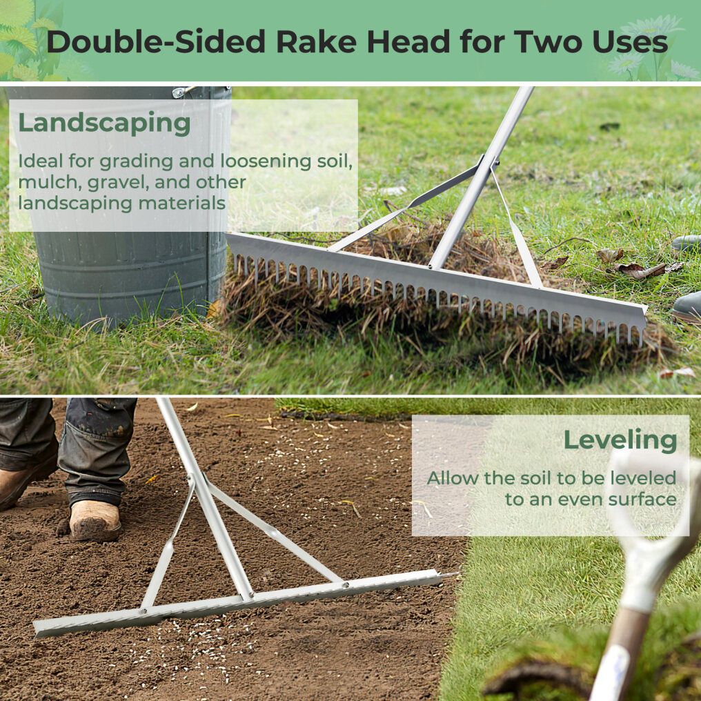 ● Versatile Double-Sided Usage: The garden lawn rake comes with a double-sided rake head for two uses-- landscaping and leveling. The side with tines is ideal for grading and loosening soil, mulch, gravel, and other landscaping materials. The smooth large side allows the soil to be leveled to an even surface.