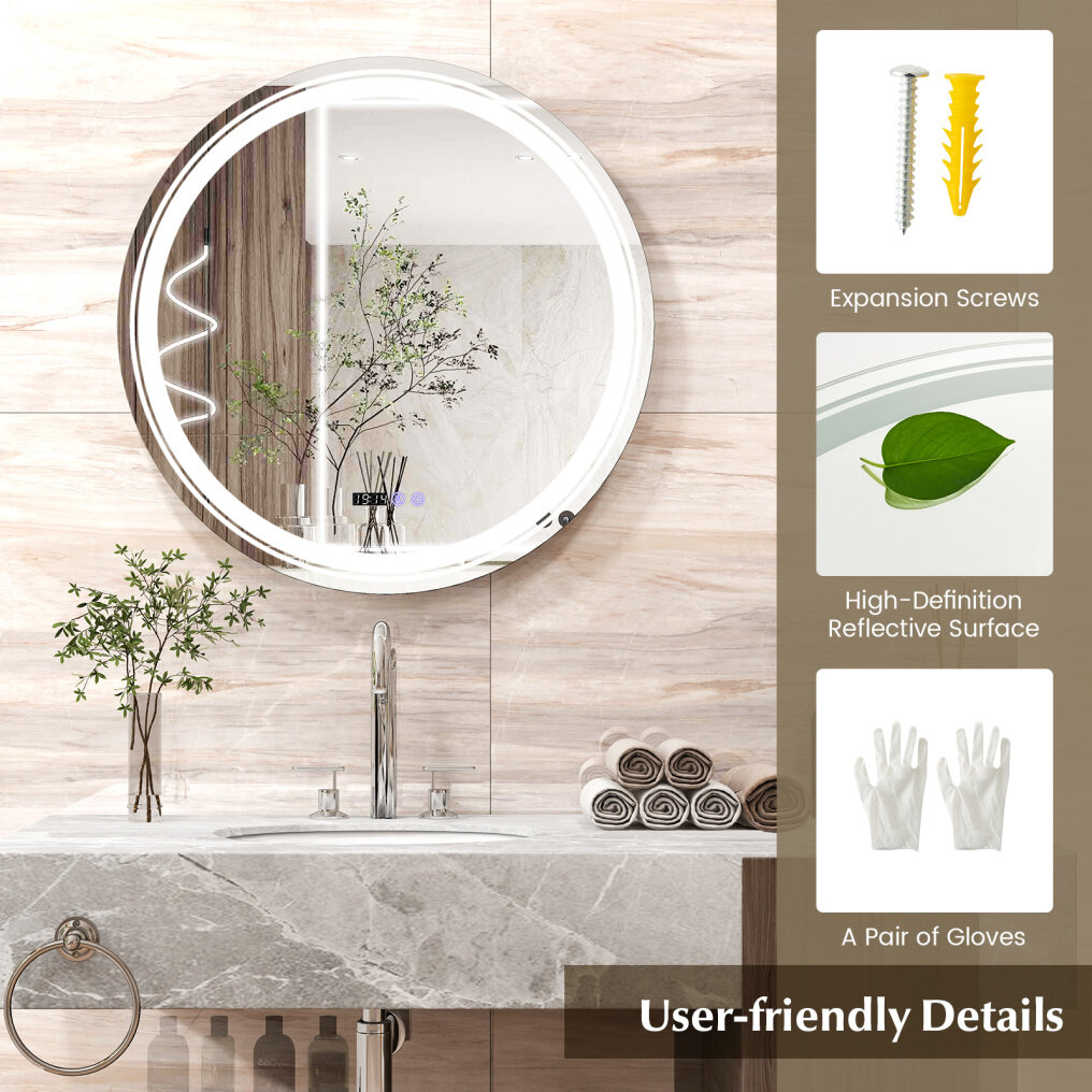 ● Anti-Fog Function: This bathroom defogging mirror comes with a defogging function that efficiently clears the fog, providing you with a clear reflection with 5-minute quick defogging efficiency. Plus, the mirror will turn off the defog modes after 1 hour of operation, saving users the trouble of manual shutdown.