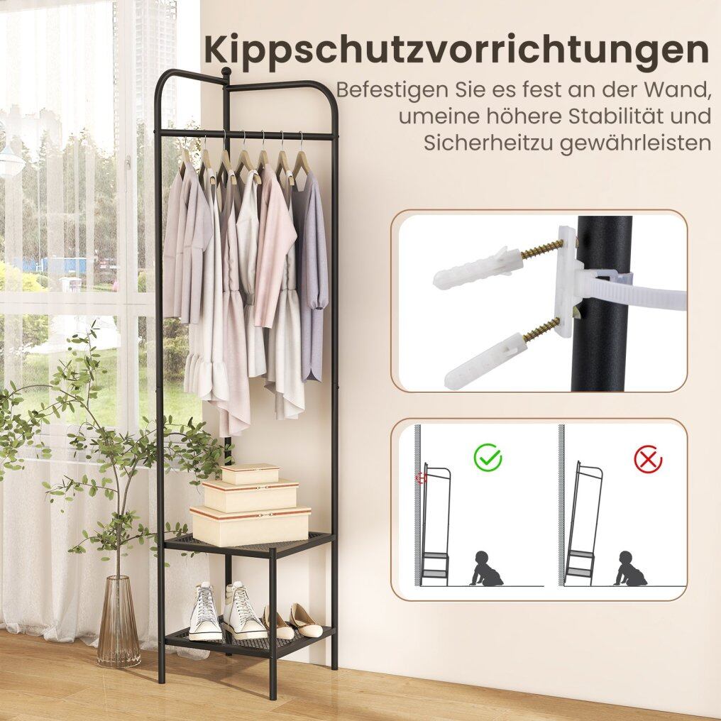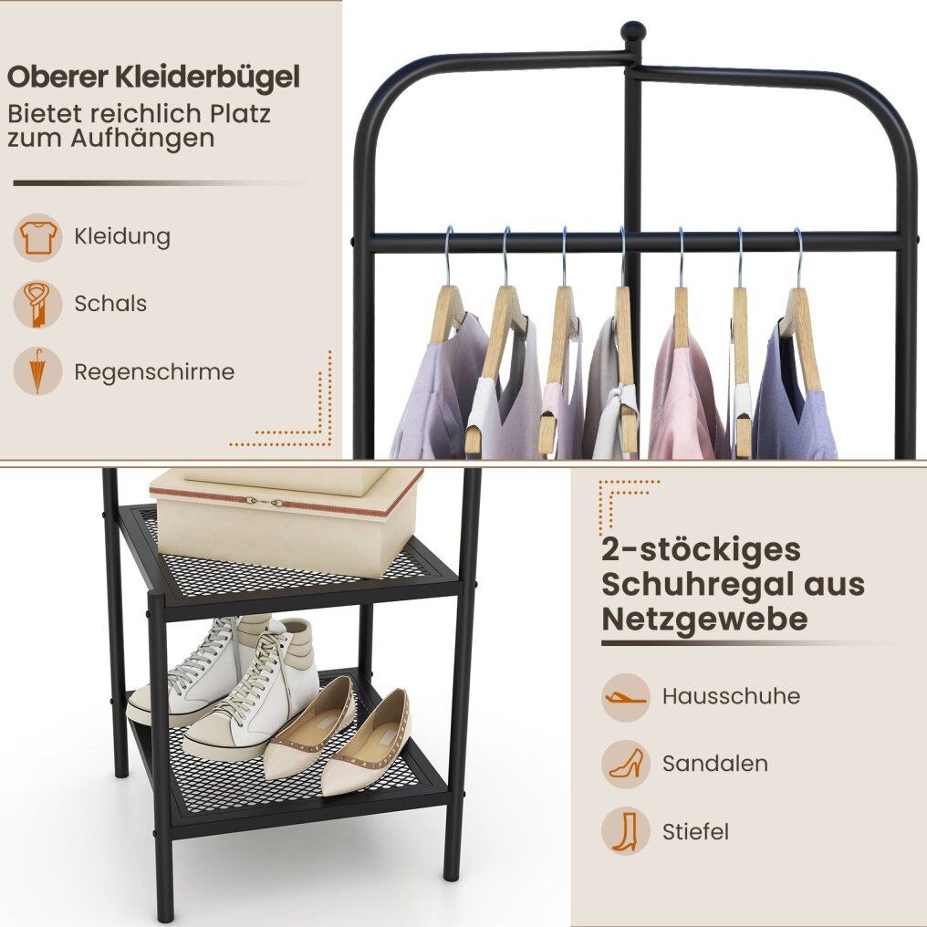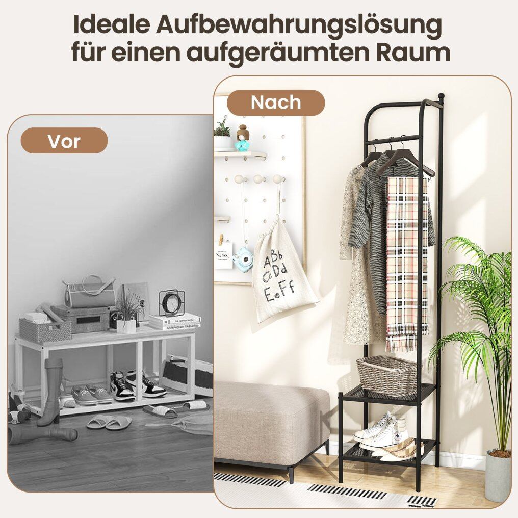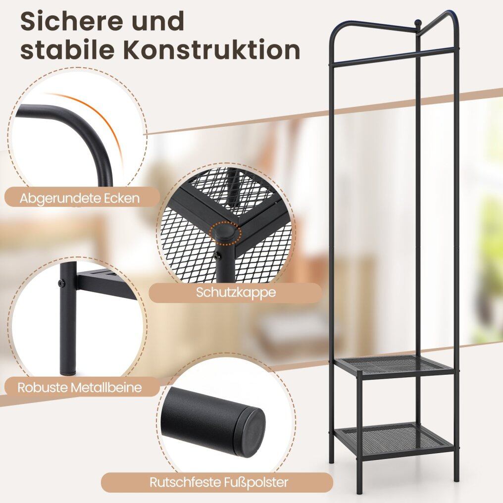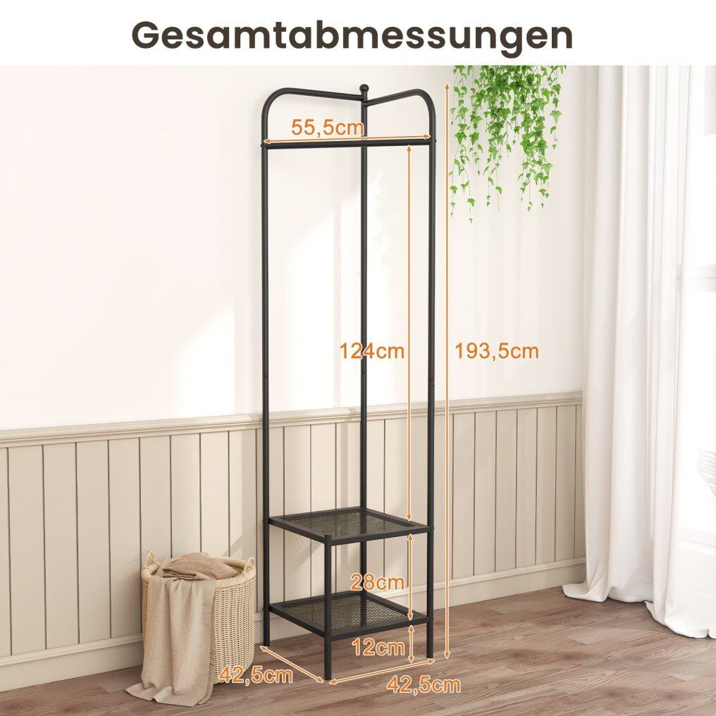 This coat rack fits perfectly into any corner and maximizes space while offering ample room to hang coats, scarves, and umbrellas. It also features two mesh shelves for storing clothes, shoes, storage baskets, and more. Measuring 42.5 x 42.5 x 193.5 cm (L x W x H), the freestanding coat rack doesn't take up too much floor space, making it ideal for any corner of your home. The solid metal frame with non-slip feet ensures stability and prevents wobbling. The anti-tip design also provides additional safety and stability.