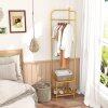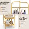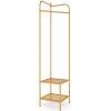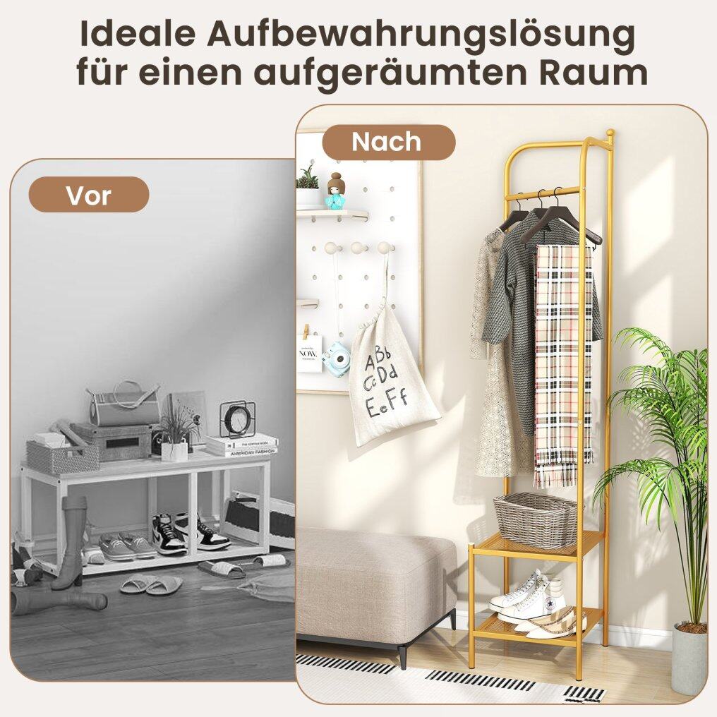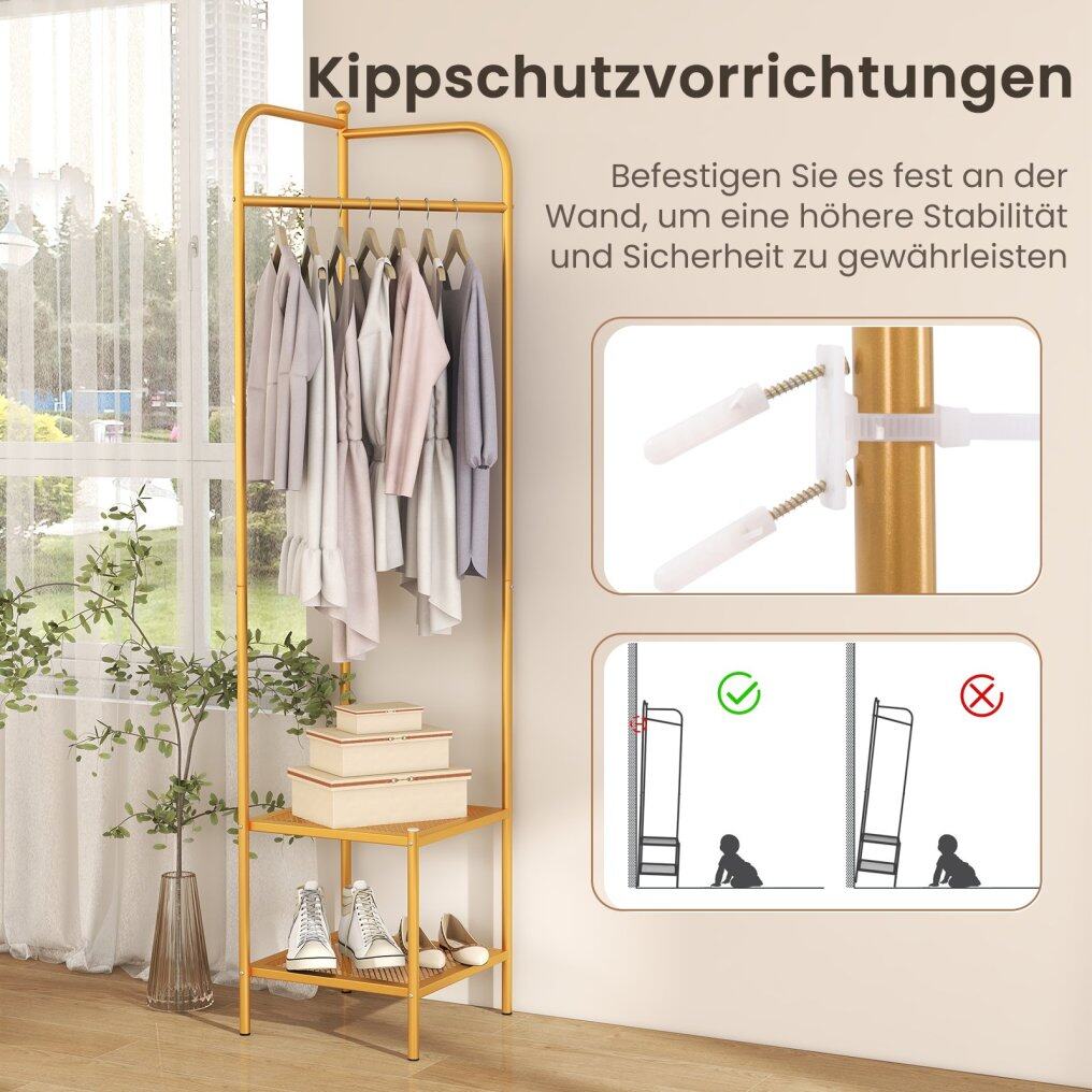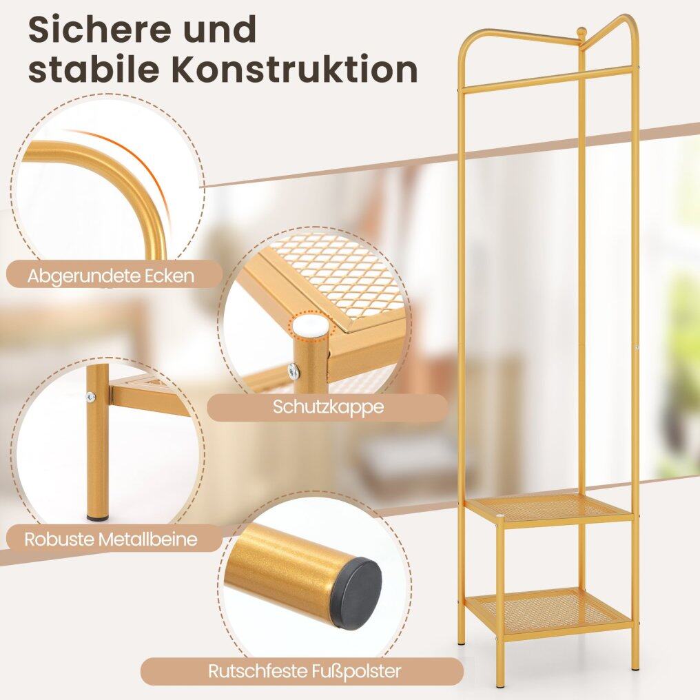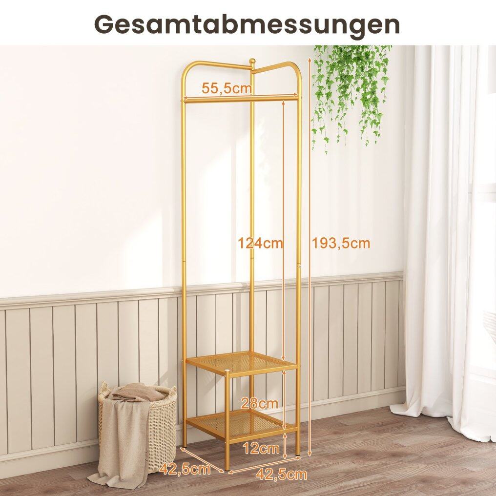 This coat rack fits perfectly into any corner and maximizes space while offering ample room to hang coats, scarves, and umbrellas. It also features two mesh shelves for storing clothes, shoes, storage baskets, and more. Measuring 42.5 x 42.5 x 193.5 cm (L x W x H), the freestanding coat rack doesn't take up too much floor space, making it ideal for any corner of your home. The solid metal frame with non-slip feet ensures stability and prevents wobbling. The anti-tip design also provides additional safety and stability.