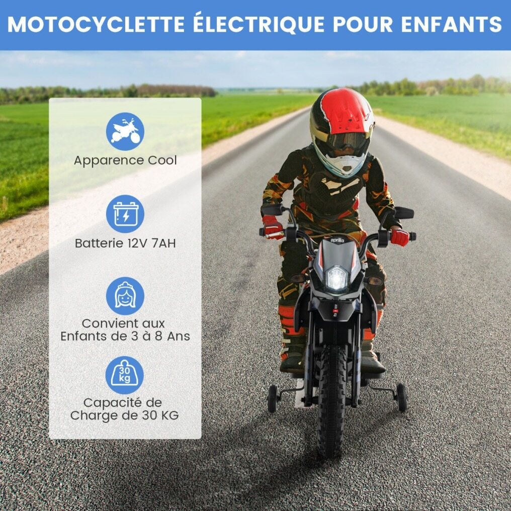 Dual Motor for High Performance : Equipped with two powerful motors, our Aprilia licensed motorcycle can reach a speed of 5.5-6km/h, offering your little one an exciting riding experience. Besides, this motorcycle is powered by a 12V 7AH battery, ensuring a playing time of 1-2 hours.