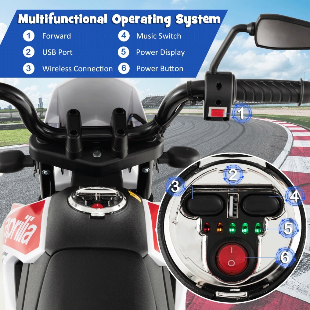 ● Perfect Gift to Take an Adventure: This 12V Aprilia licensed motorbike is an ideal gift for kids' birthdays or other special days. Certified by ASTM and CPSIA, it's safe enough for kids from 3 to 8 years old to take an adventure. During riding, they can exercise fine motor skills and develop hand-feet coordination.