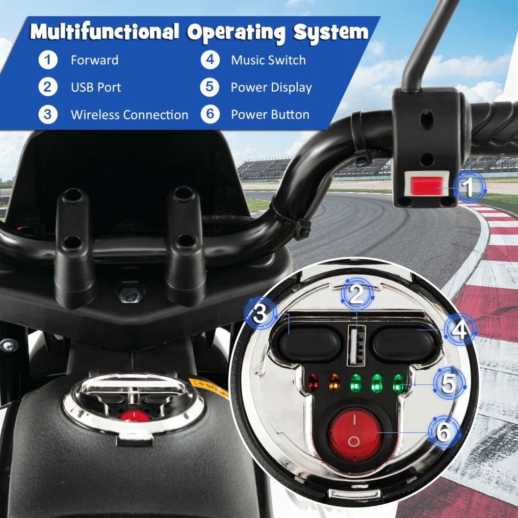 ● Cool and Fun Ride On Motorcycle: Cool mudguard, bright headlight and simulated exhaust pipe make this ride on toy look like a real motorcycle. Kids can press the power button and forward button to start or move it. Plus, there are different music to choose. It also has USB port and wireless function for more music options.