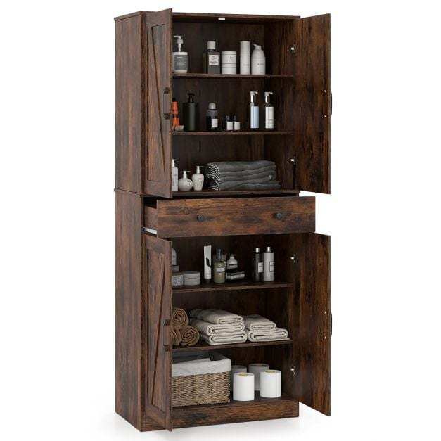● Farmhouse Chic: Transform your kitchen with farmhouse style and functionality! Four charming barn doors of the utility cabinet add rustic elegance, while multiple installation options let you customize the look to fit your space perfectly.