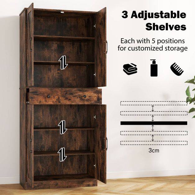 ● Ample Storage: Designed for an organized kitchen, the tall pantry has two spacious 2-door cabinets, boasting a fixed shelf and 3 adjustable shelves, each with 5 positions for customizable storage. Plus, enjoy versatile options with a pull-out drawer that keeps everything within reach!