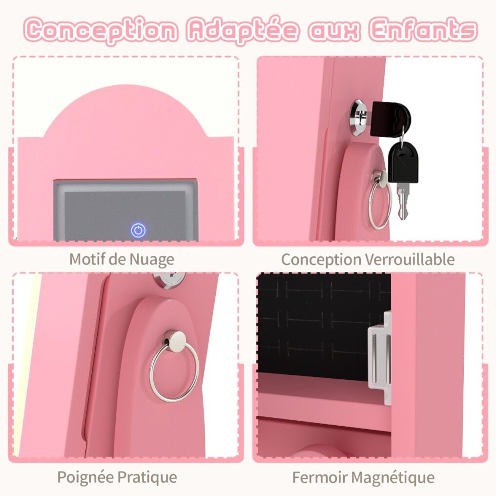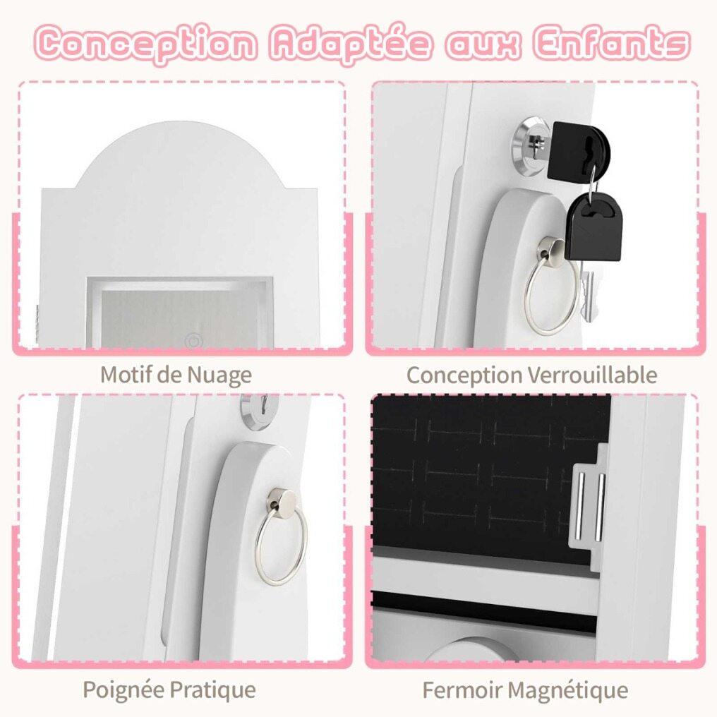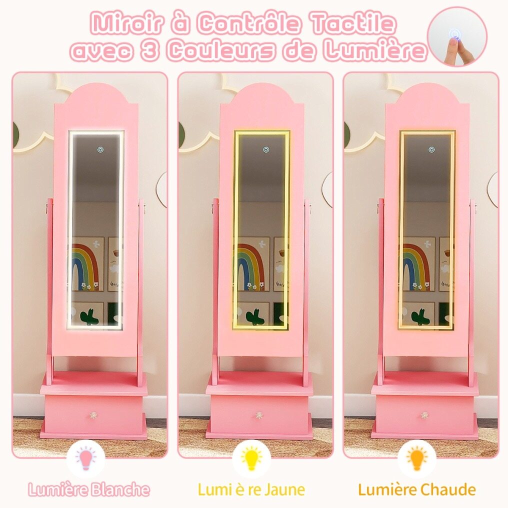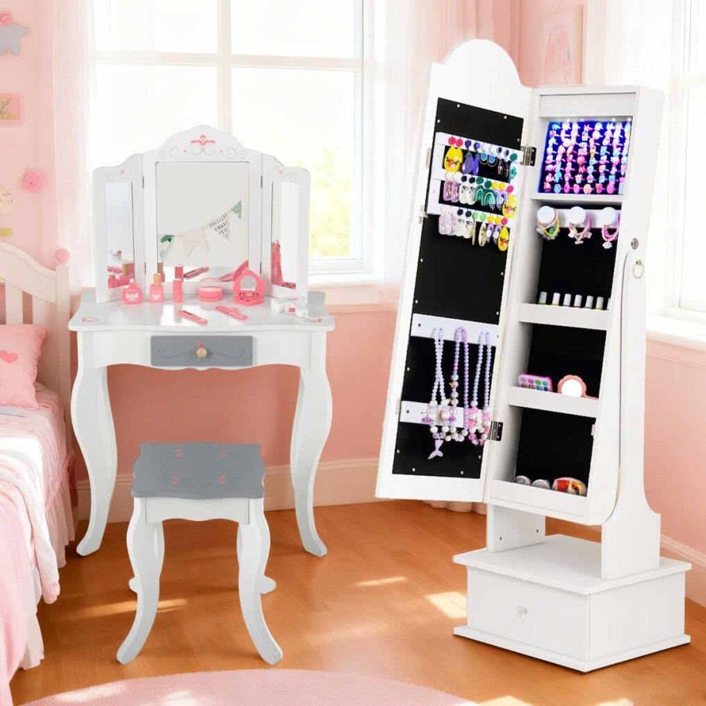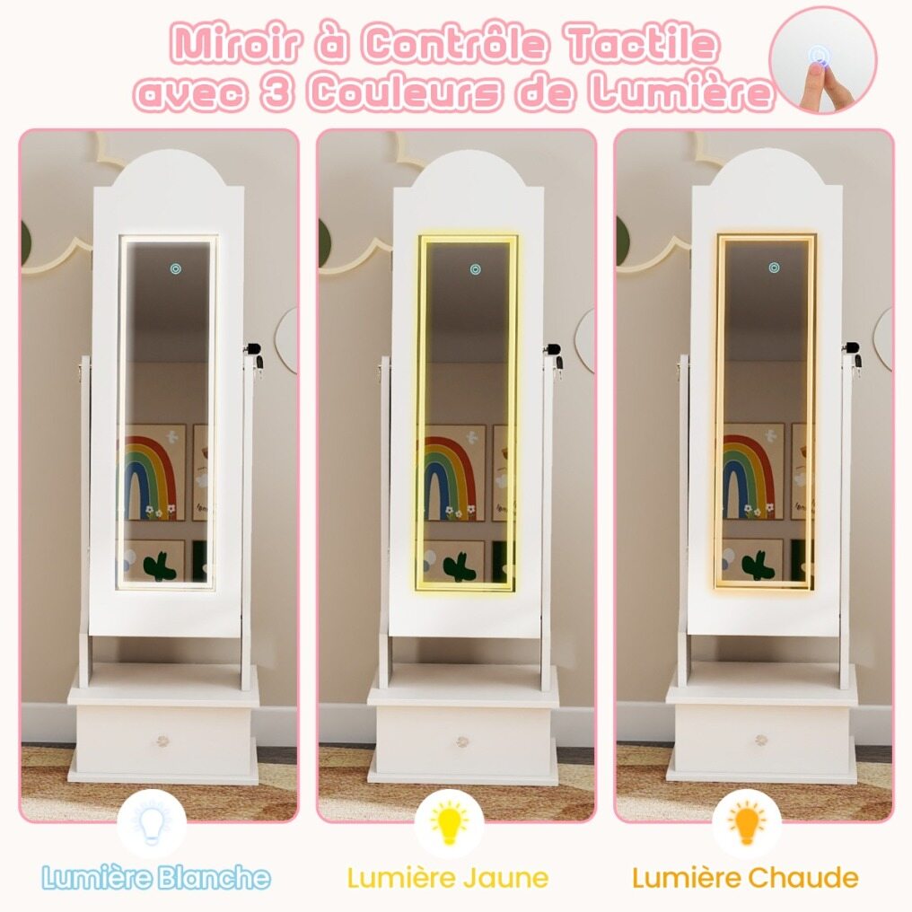 【Light Strip & 4 Interior Lights】 The full-length mirror features 3 light colors (warm light, yellow light, white light). Your child can adjust the light color via the touch control. Additionally, the 4 interior lights automatically turn on when the jewelry cabinet is opened, providing optimal lighting for choosing jewelry.