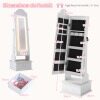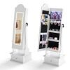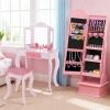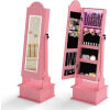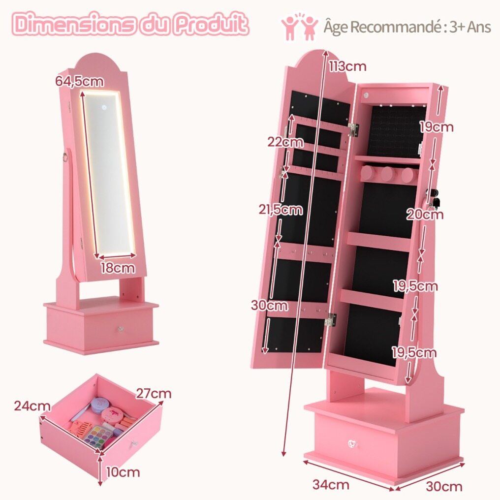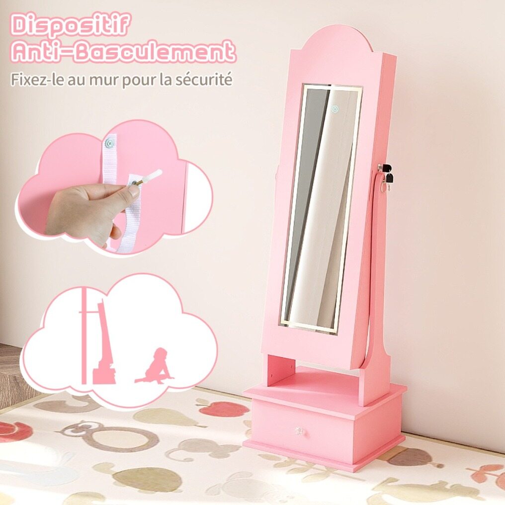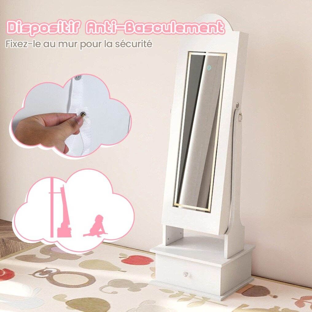 Create a charming space for your little princess to organize her treasures with our children's jewelry cabinet with lighting! The full-length mirror provides a head-to-toe view. The cabinet offers multiple shelves, hooks, and perfect spots for storing necklaces, bracelets, earrings, and more. Children can also store their belongings in the drawer. Two adjustable tilt angles are available. In addition, four LED lights illuminate the interior, making it easy to find their favorite accessories. The crown design and bright lights create a whimsical look that children love. For safety and sturdiness, the freestanding cabinet also features an anti-tip device and a solid base.