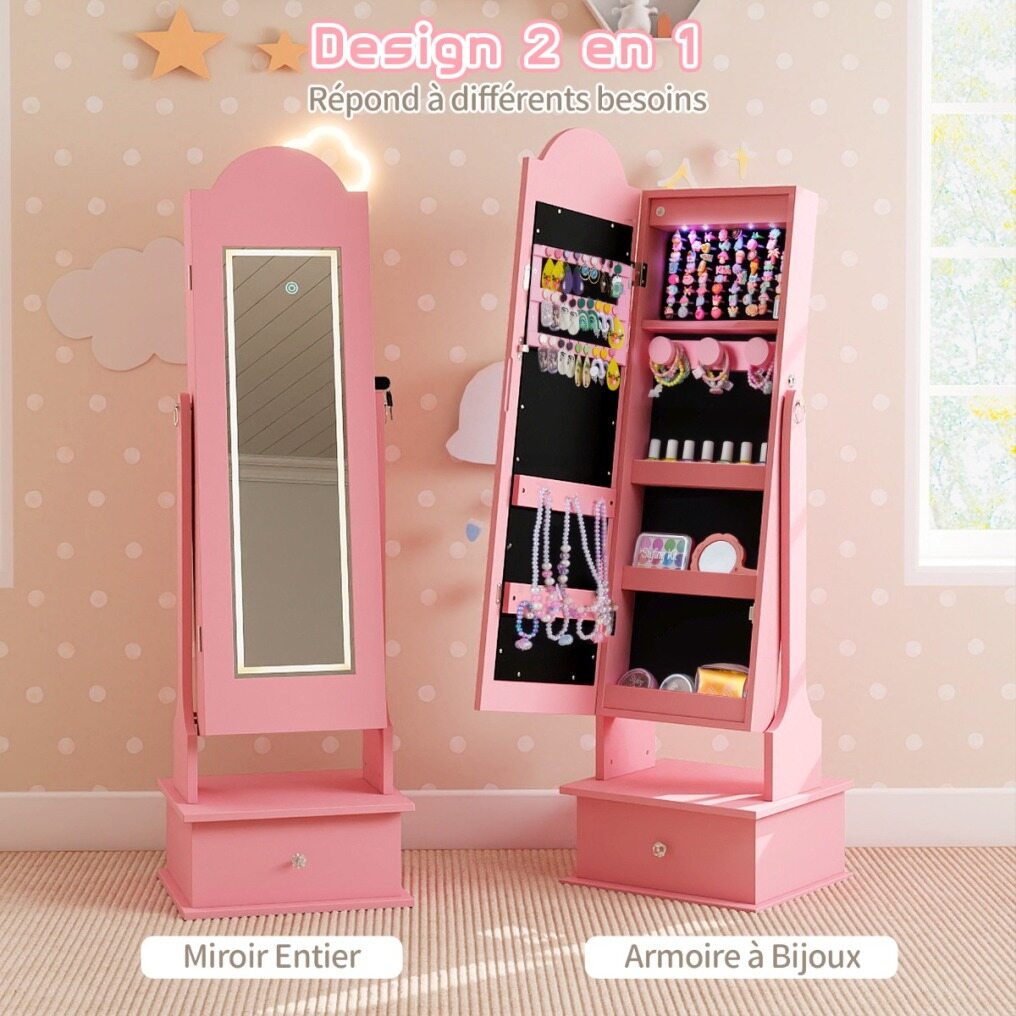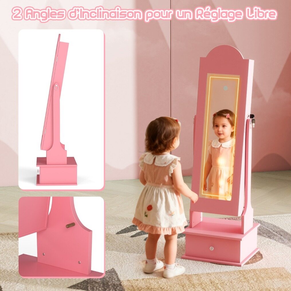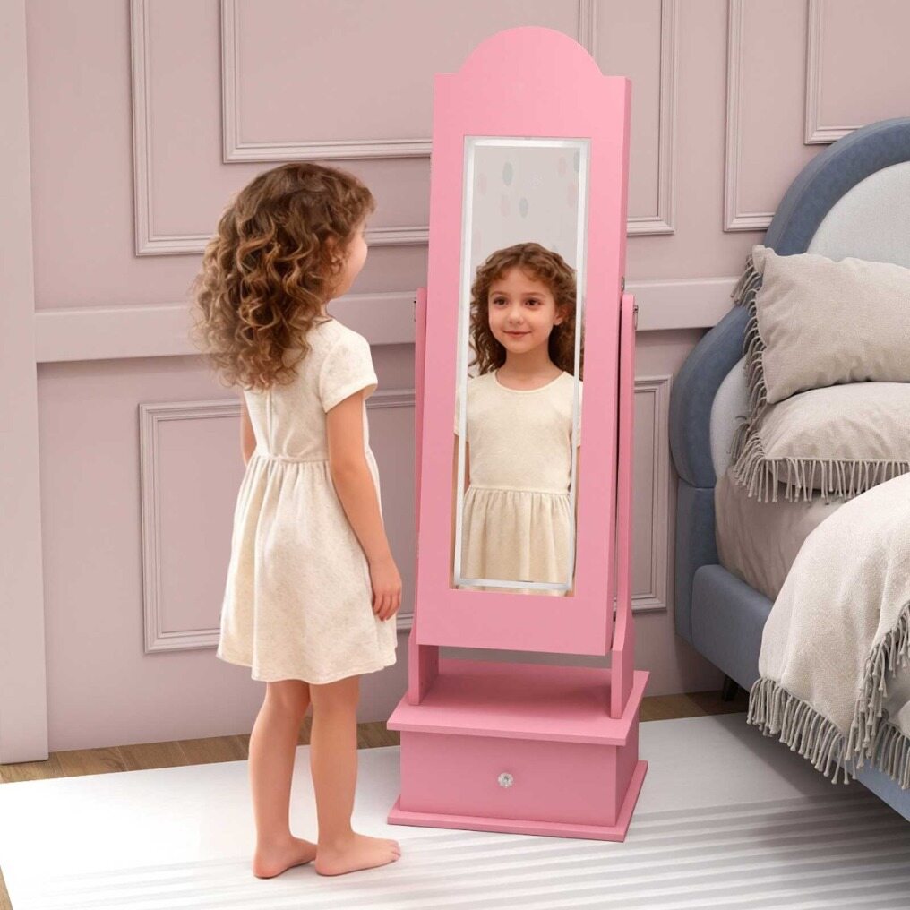 【Practical 2-in-1 Design】 This children's jewelry organizer perfectly combines a full-length mirror and jewelry cabinet, allowing kids to have fun dressing up. The full-length mirror lets them see their outfit from head to toe, and the two adjustable angles allow them to choose the optimal angle for getting ready.