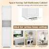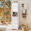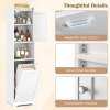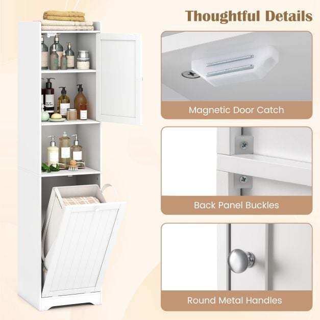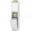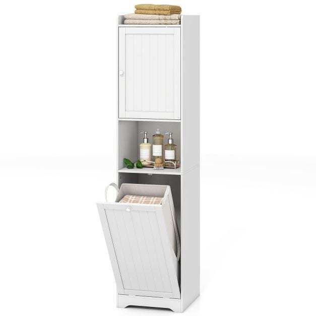 Our tall, slim cabinet offers plenty of storage space in tight spaces like bathrooms or laundry rooms. It comes with a handy laundry basket with an easy-to-lift and carry bag, as well as shelves and compartments to organize everything else. The top shelf has raised edges to keep items safe, while the adjustable panel in the upper cabinet adapts to your storage needs. With anti-tip safety features and a reinforced connection structure, it resists warping and keeps your items safe. Keep your laundry room organized and essentials accessible with our tall bathroom cabinet!