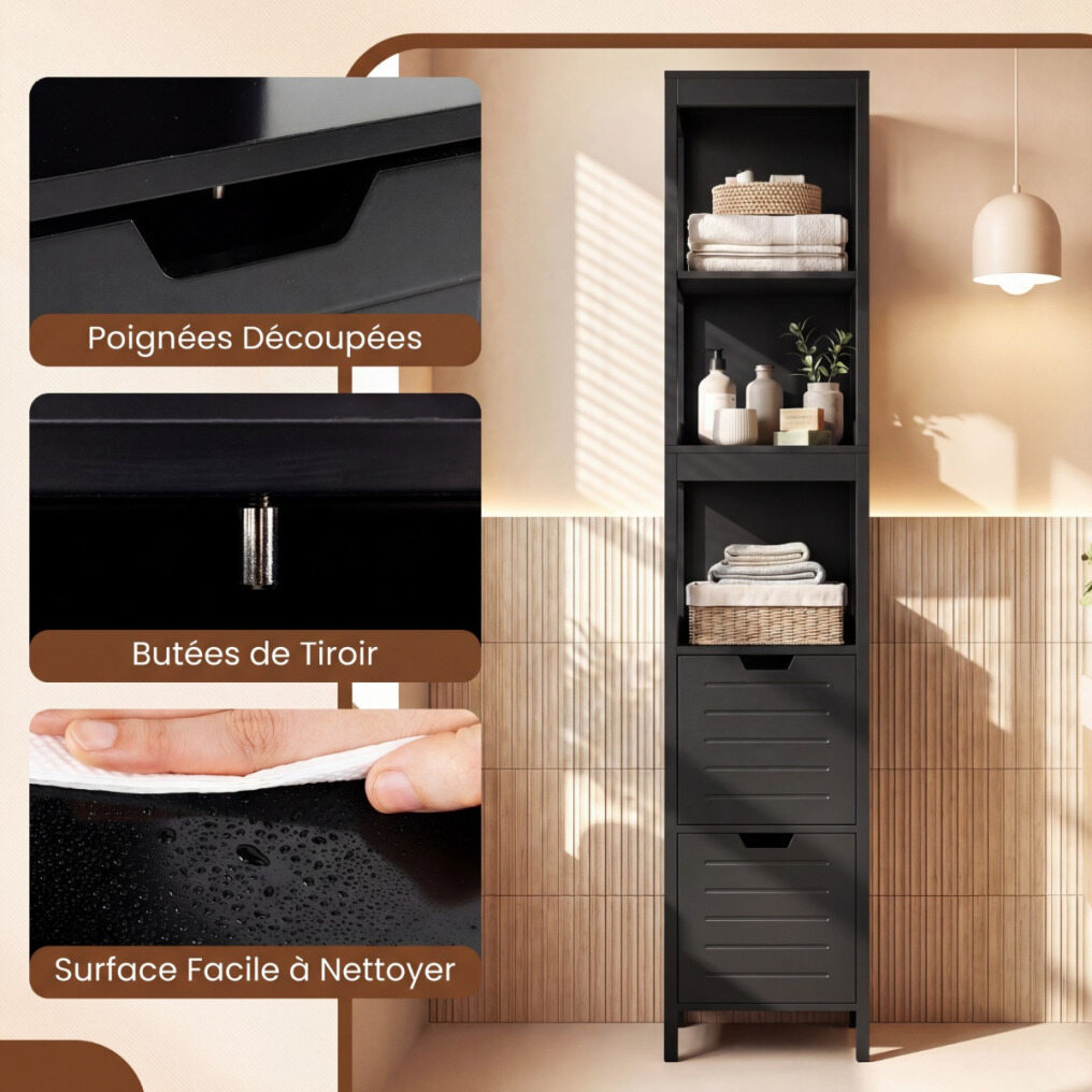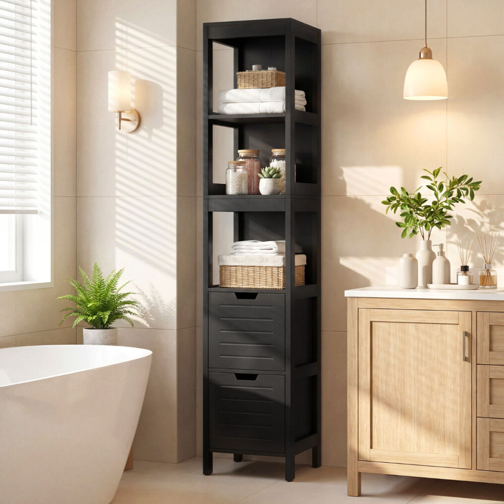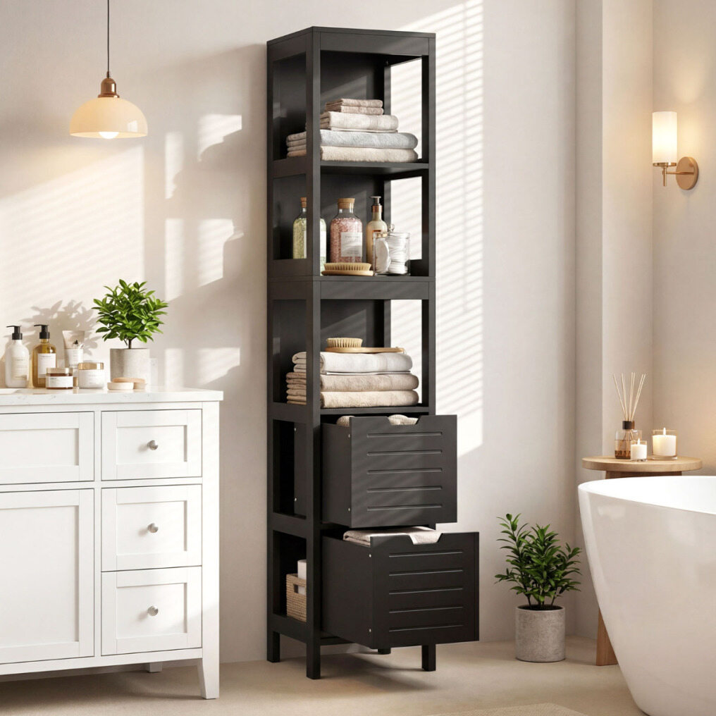 【Super Bathroom Column】This item has 2 drawers, where you can store non-waterproof items such as towels. It also has 4 open storage shelves, allowing you to store many daily necessities: shampoo, shower gel, facial cleanser, toothbrush, toothpaste, razor, and various skincare products.