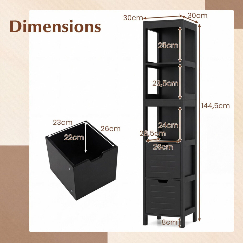 Our storage cabinet has 2 drawers and 4 open storage shelves. It's waterproof and corrosion-resistant, so you can place it in the bathroom or toilet. Of course, you can also put it in any other room: living room, bedroom, hallway, office, etc. Don't hesitate! Buy one for your home!