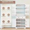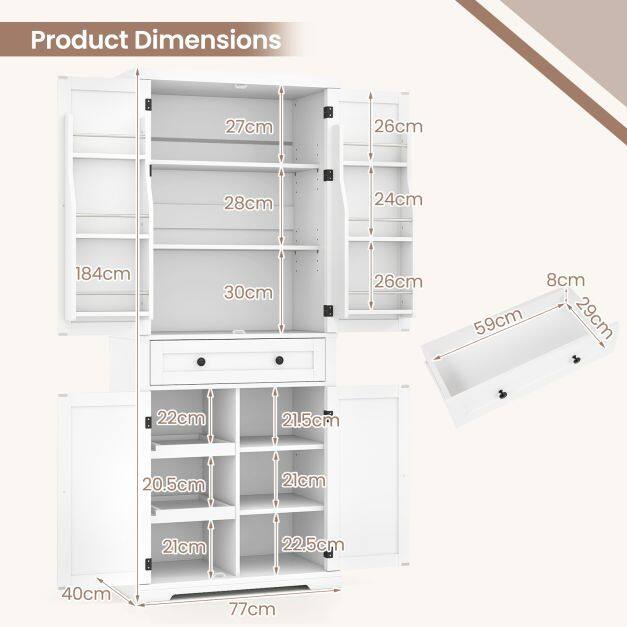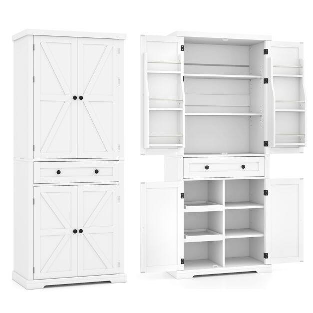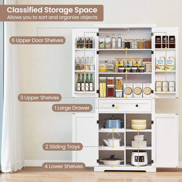 Versatile storage design: This pantry cabinet offers a thoughtful layout with 3 top shelves, 6 door shelves, a large drawer, 2 sliding trays, and 4 bottom shelves. The comprehensive design allows for efficient categorization and organization of your kitchen utensils, keeping them readily accessible and neatly stored.