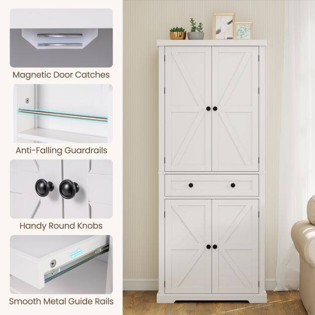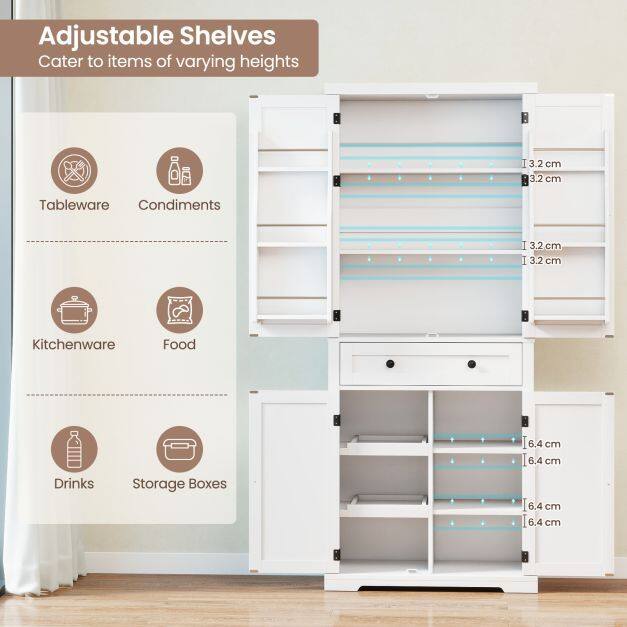 This freestanding storage cabinet offers a versatile storage layout with multiple shelves, sliding trays, and a large drawer to keep your kitchenware neatly organized. Adjustable shelves allow you to efficiently store items of varying heights. Anti-tip devices create a secure environment, while the protective railing prevents items from falling. Additionally, the tall freestanding cabinet is equipped with convenient handles and smooth-gliding metal runners for effortless handling. With its modern design, this tall pantry cabinet is the perfect addition to dining rooms, living areas, and many other spaces.