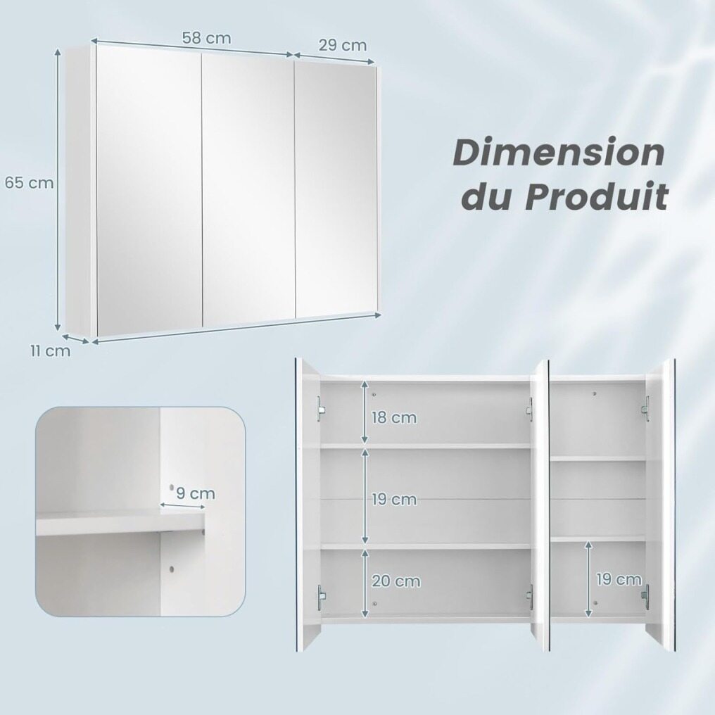 【Ample Storage Space】This medicine cabinet is designed with 3 high-definition mirrored doors and utilizes wall space to create more storage capacity. Six storage compartments provide ample room for your toiletries, cosmetics, skincare products, and much more.