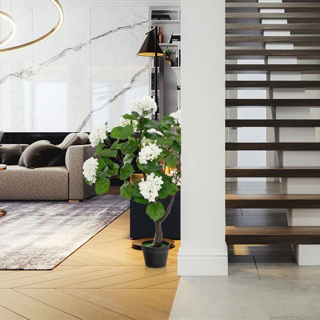Infuse Vitality to Your Space: Equipped with 11 lifelike hydrangea flowers, 88 lush verdant leaves and simulated trunks, this artificial flower tree highly mirrors the beauty and vitality of a real hydrangea tree. The flowerpot is even adorned with faux grass, providing an added touch of vigour.