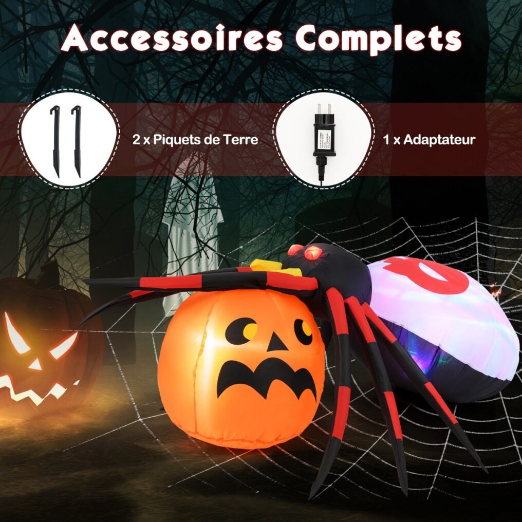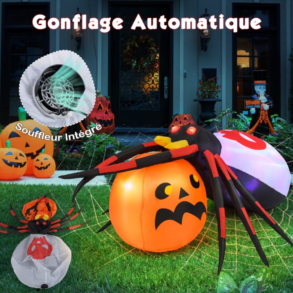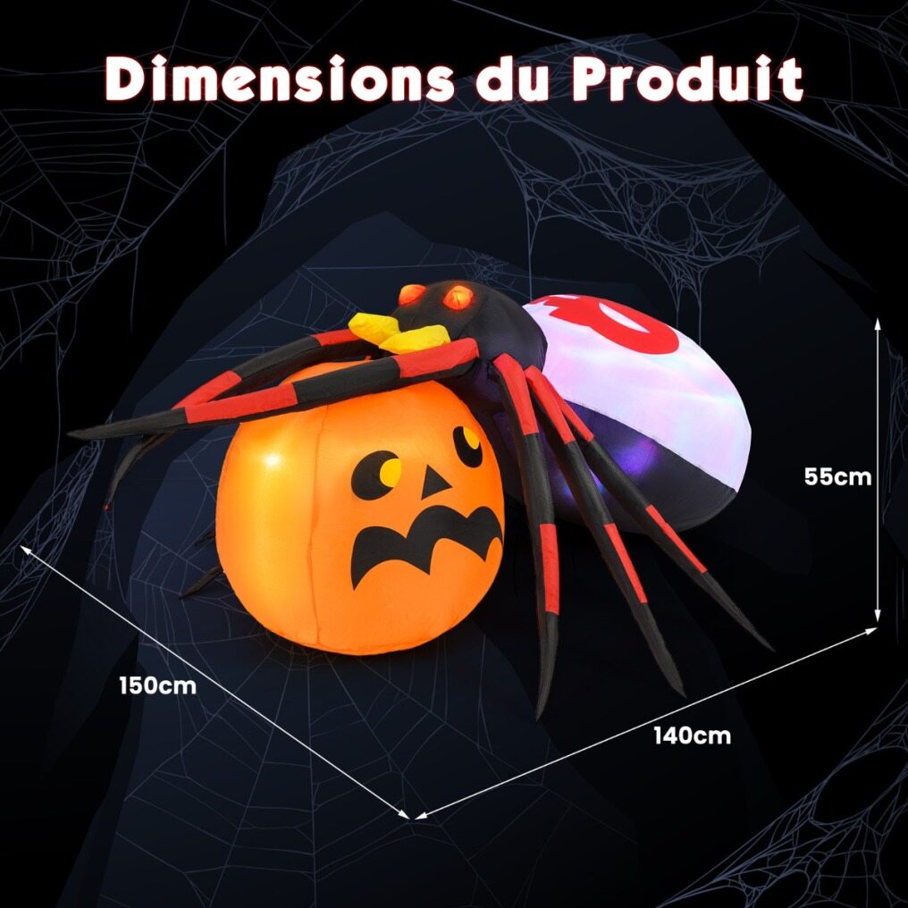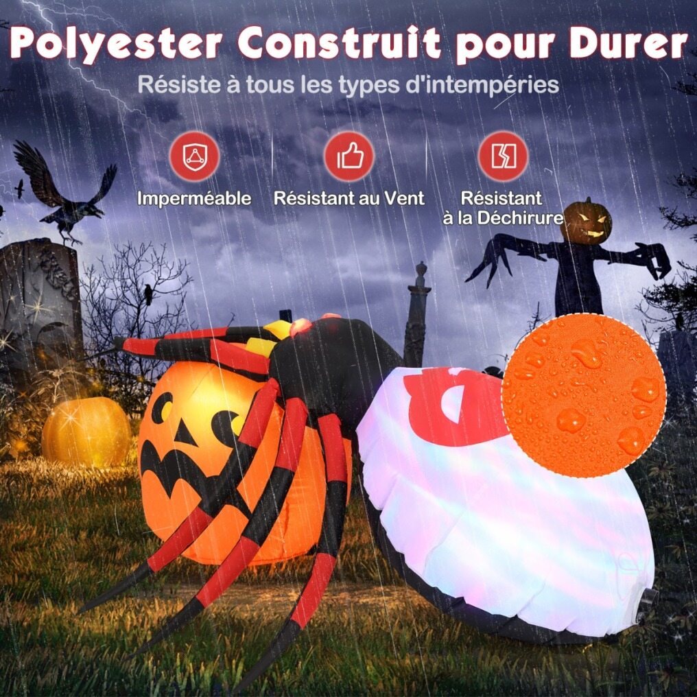 Unleash the Halloween spirit with this giant inflatable spider. This decoration combines a realistic spider with a pumpkin, with LED light, rotating light and flashing eyes for a truly terrifying effect. Made of quality polyester, it can withstand all kinds of weather elements, ensuring that your decoration will remain durable. With an automatic inflation system, setup is simple. Embrace the eerie atmosphere and make this Halloween the most memorable with this inflatable spider and pumpkin.