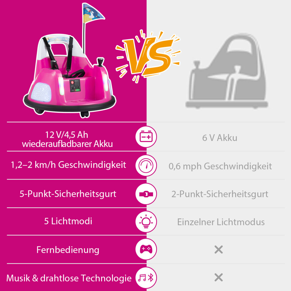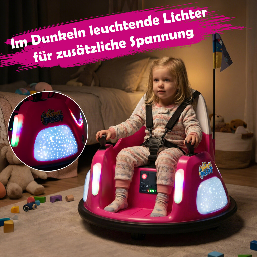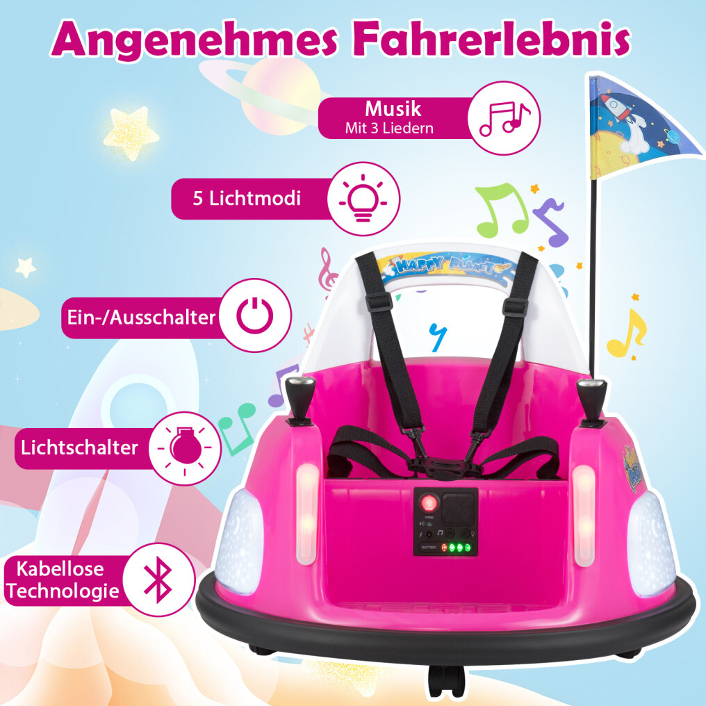 Safety first: Equipped with a 5-point harness, the bumper car ensures that children are securely strapped in during the ride. Soft bumpers around the vehicle absorb impacts and protect against collisions, while the high backrest provides excellent support for young drivers.