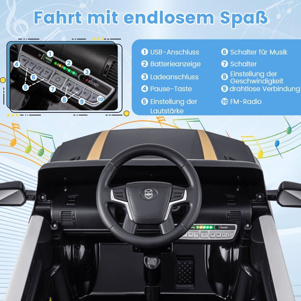 Exciting fun features: With a host of exciting features—sirens, LED flashing lights, wireless connectivity, and USB ports—this 12V police car offers an immersive experience that stimulates your child's imagination and role-play skills. Bright LED headlights and lively sound effects further enhance the fun.