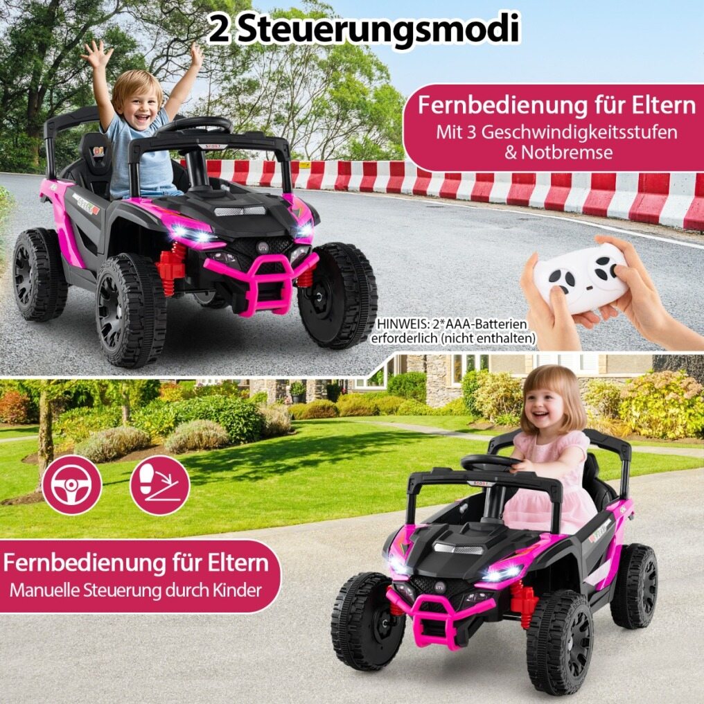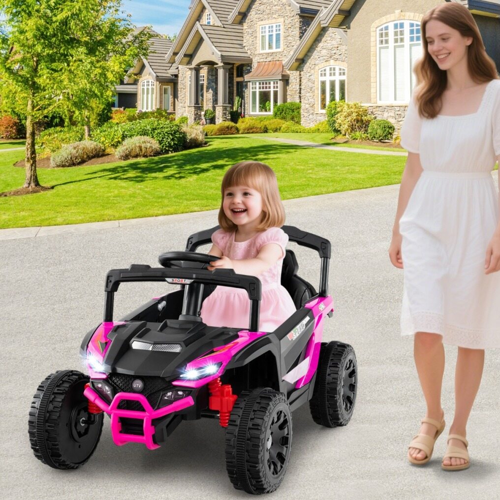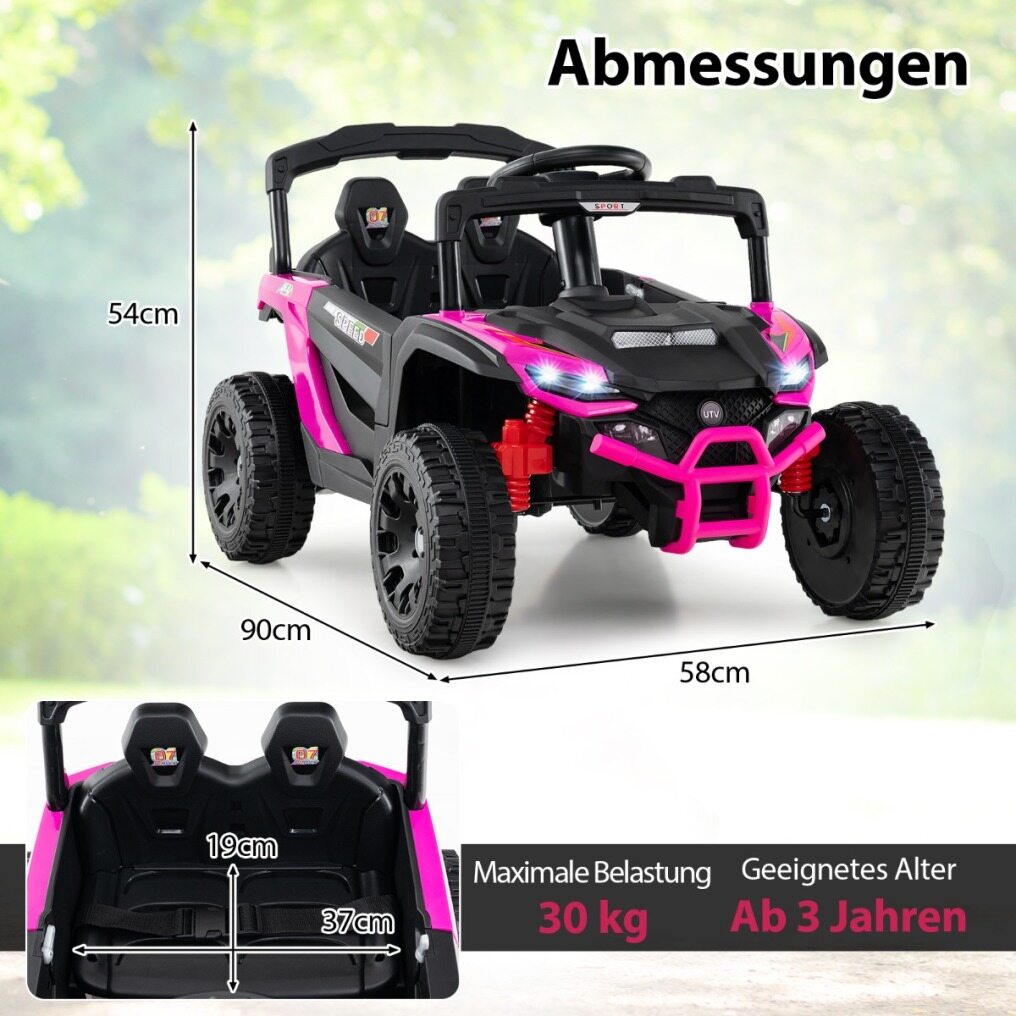 Powerful Performance: The battery-powered UTV is equipped with two 25W motors and a 12V/4.5A battery, providing powerful performance for adventurous rides. It supports a 45° gradeability and a maximum speed of 5 km/h, with smooth starting and stopping functions for smooth control.