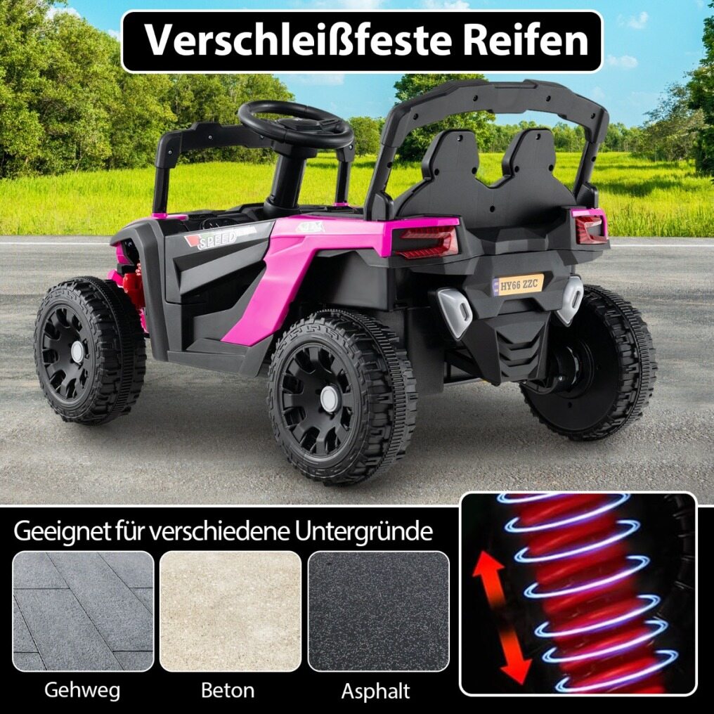 Thoughtful Details : Designed with your child's comfort and safety in mind, this electric vehicle features a spacious seat with a safety belt and two lockable doors. Suspension ensures a smooth ride on various surfaces, including sidewalks, concrete, and asphalt, thanks to its wear-resistant tires.