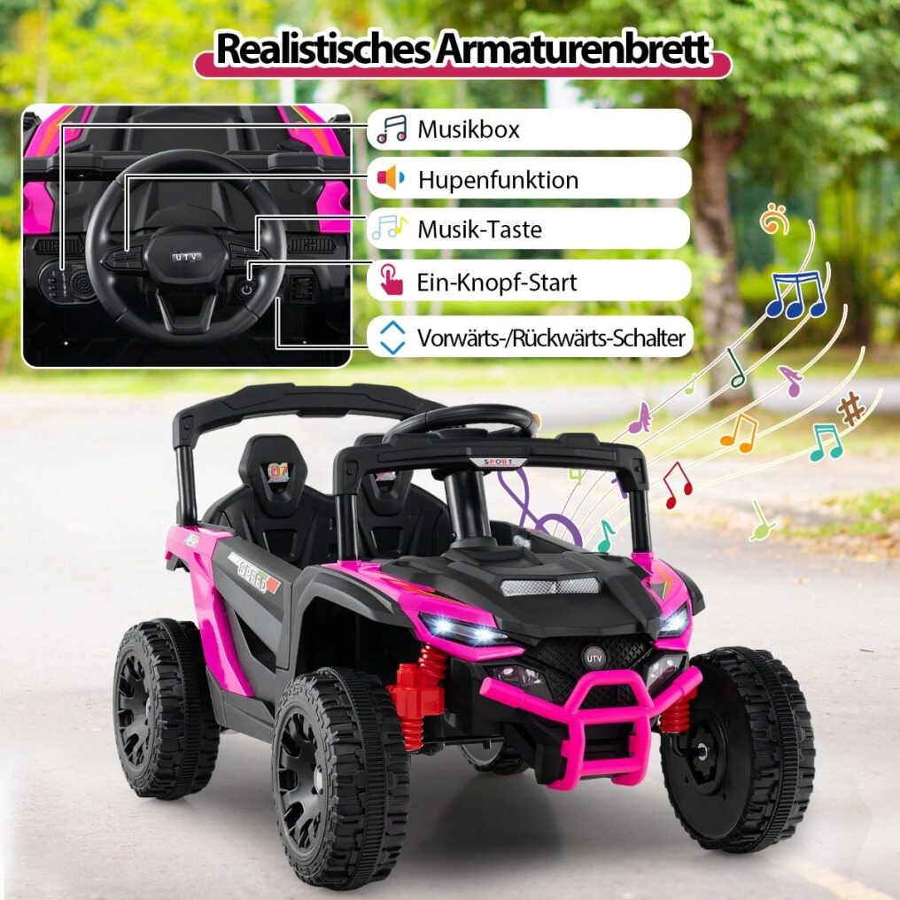 Let your child take the wheel with interactive pedals and steering wheel, or take control with the convenient remote control for peace of mind. Watch your child race over hills at speeds of up to 5 km/h with the robust 12V battery and two powerful motors! The adventure doesn't end when the sun goes down, thanks to the LED headlights that inspire imagination on every ride. Enjoy the realistic sounds and music from the dashboard that make play immersive.