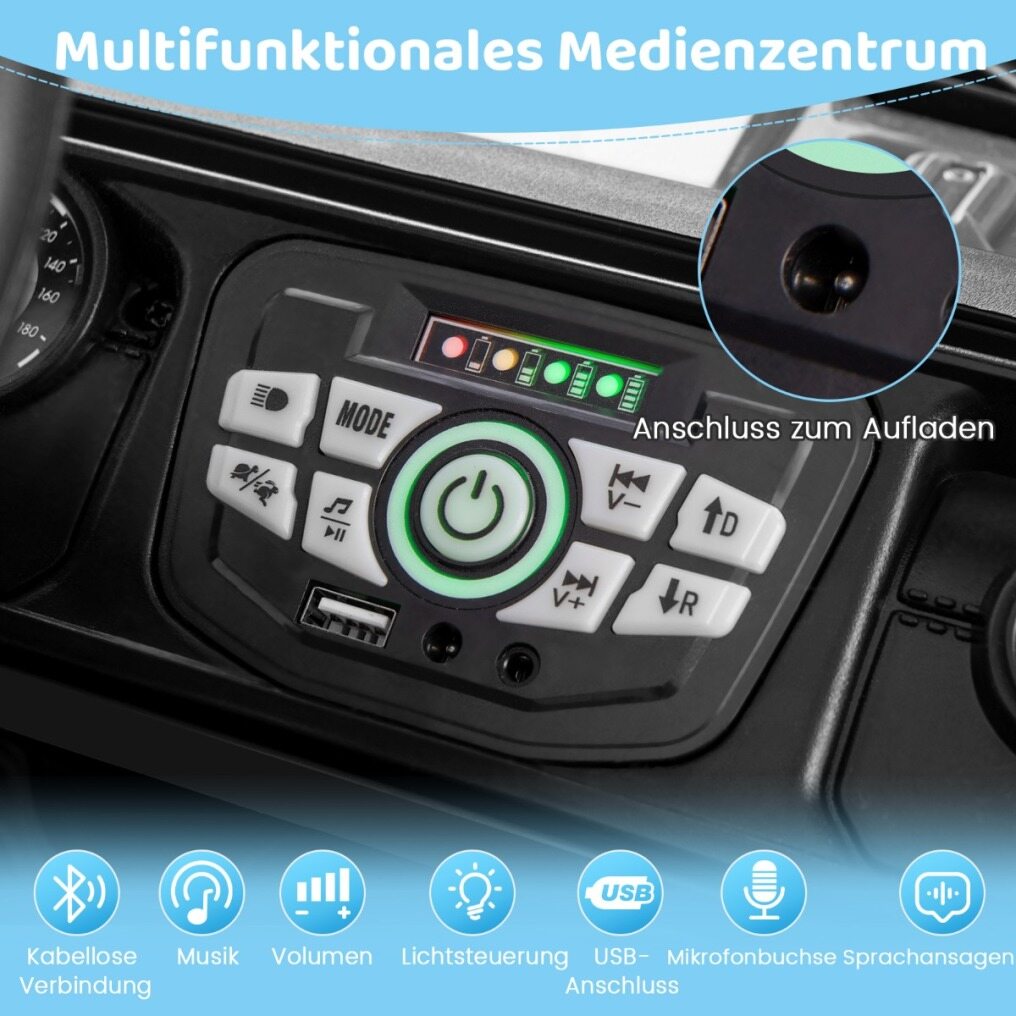 Multimedia functionality: The electric car features voice prompts and a clever wireless connection, including volume control and a USB port for personal playlists. It also includes a microphone connection for aspiring performers and light control for dynamic rides.